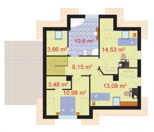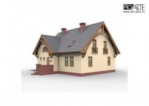 Wiatrołap prowadzi do komunikacji, z której w lewo można przejść do kotłowni oraz pomieszczenia gospodarczego. Natomiast od komunikacji na prawo znajduje się mała łazienka, dobrze doświetlony pokój z trzema oknami oraz salon, pokój dzienny, częściowo połączony z kuchnią i jadalnią, to właśnie z nich można przejść na taras, który z pew
