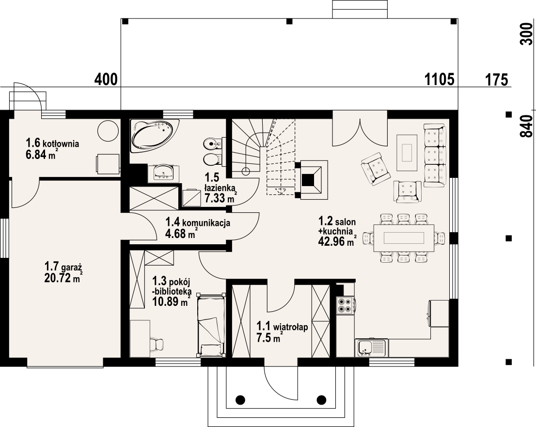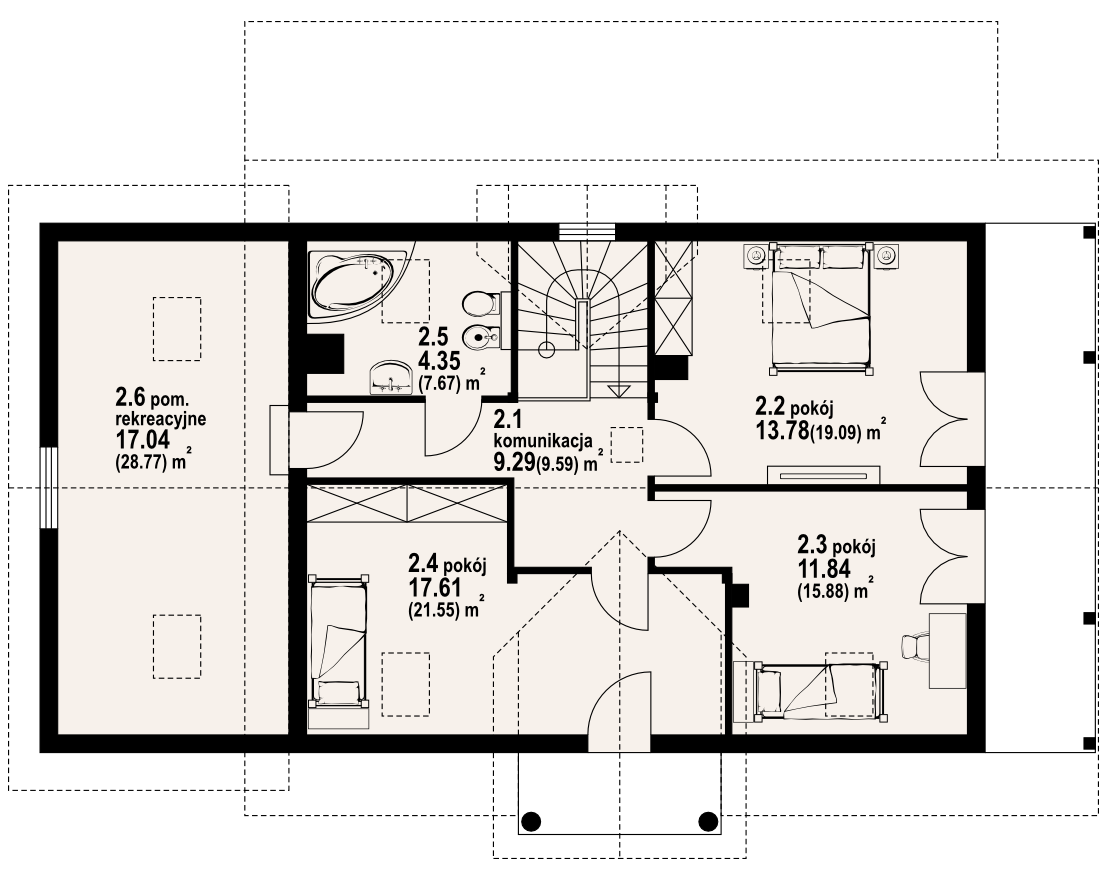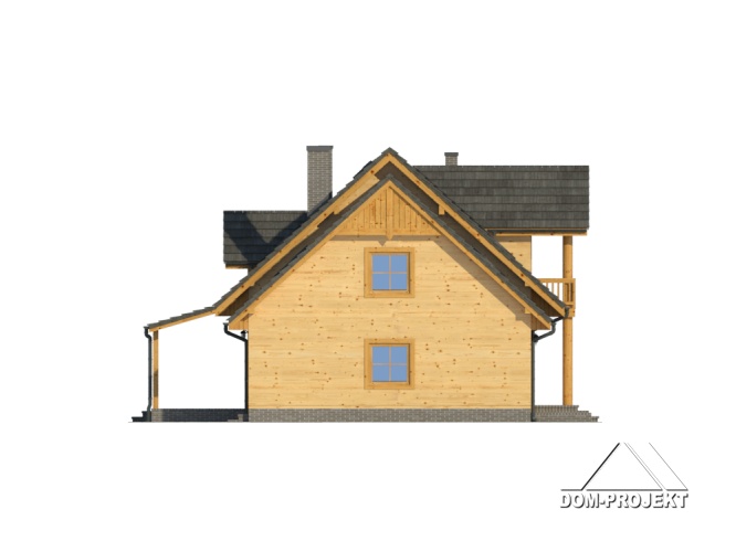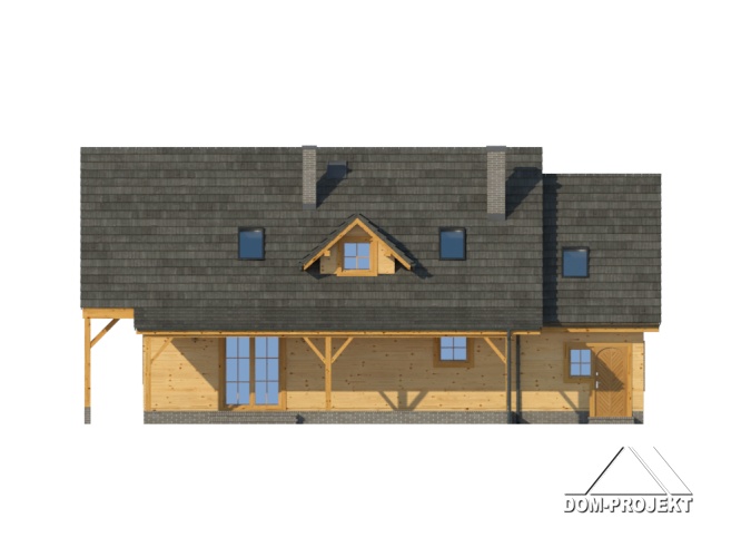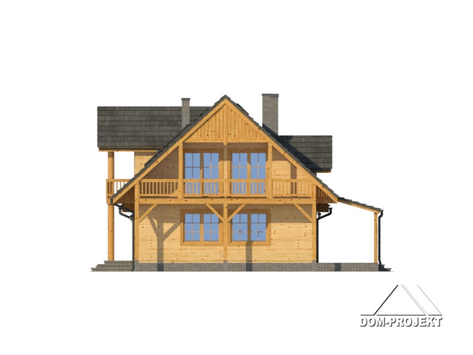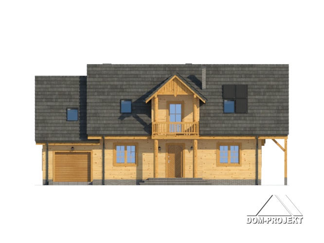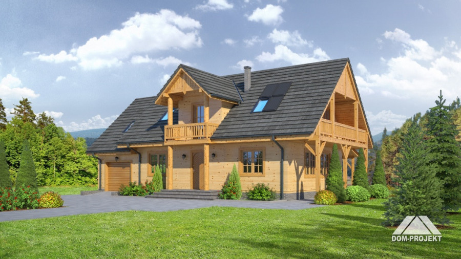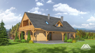 Dom w konstrukcji szkieletu drewnianego. Duży salon z aneksem kuchennym, kominkiem, schodami na poddasze i wyjściem na zadaszony taras. Łazienka, pokój,wiatrołap, przejście do garażu, garaż, kotłownia. Na poddaszu cztery pokoje, łazienka i komunikacja. Dwa balkony.