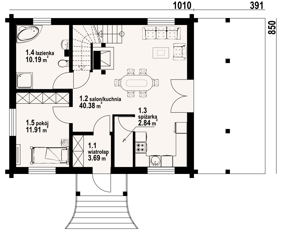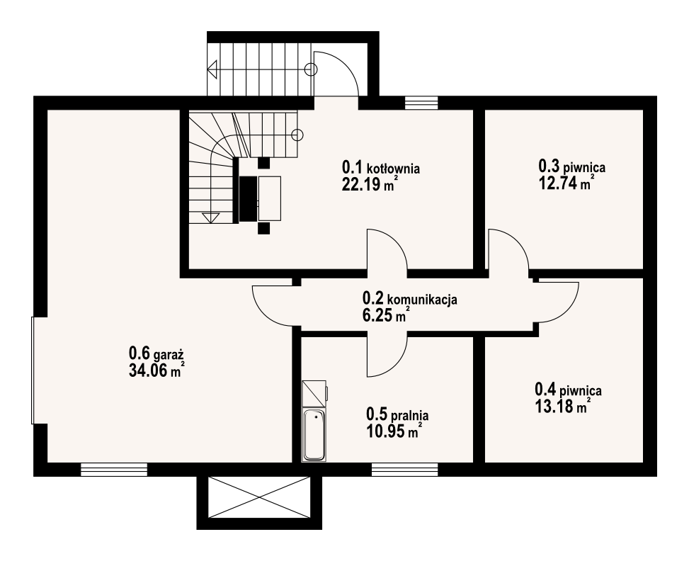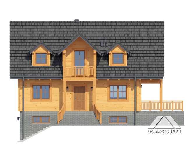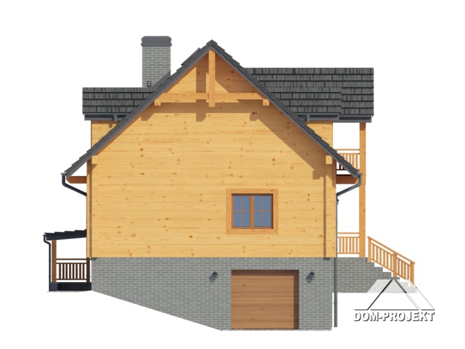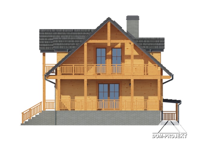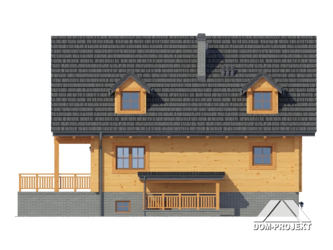 Dom z bali drewnianych. Piwnice, parter, poddasze. Duży salon z aneksem kuchennym, kominkiem, schodami na poddasze i wyjściem na zadaszony taras. Pokój, łazienka, spiżarka i wiatrołap. Na poddaszu trzy pokoje, łazienka, dwa balkony i komunikacja. W piwnicach garaż, kotłownia, pralnia, piwnice i komunikacja. Zwarta bryła budynku i dach dwuspadowy sprzyjają szybkiej i taniej budowie i niskim kosztom eksploatacji.