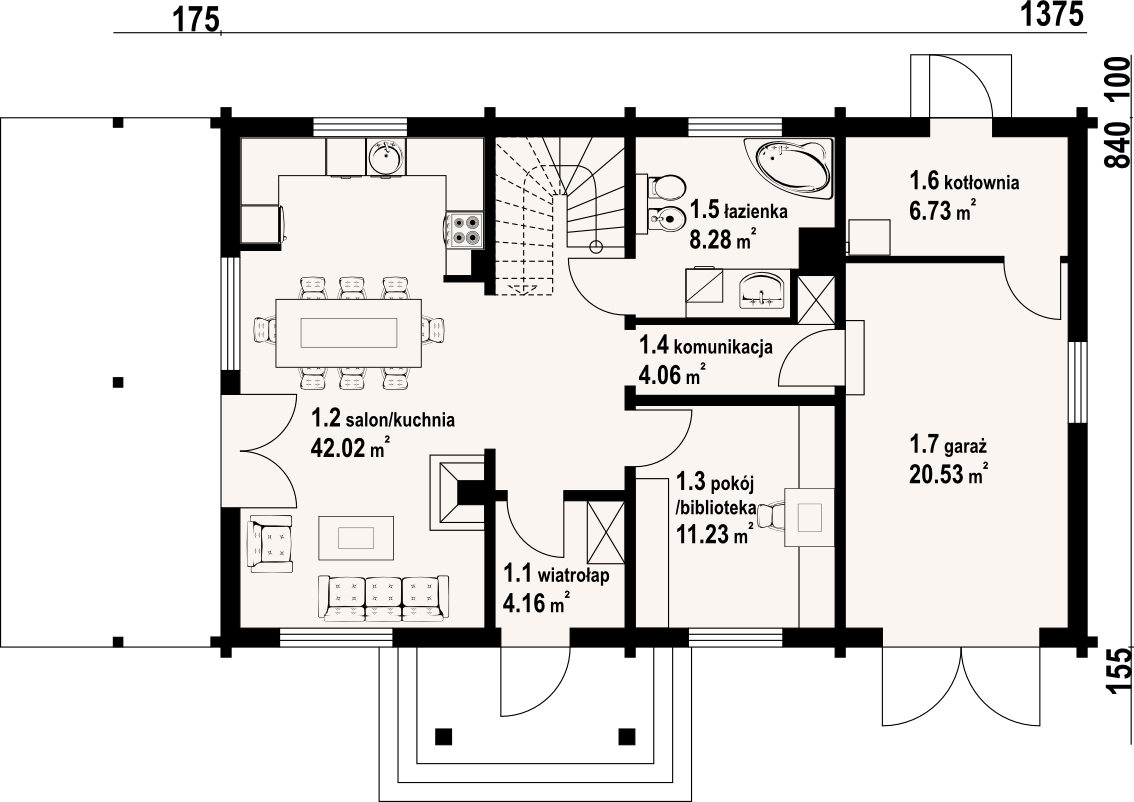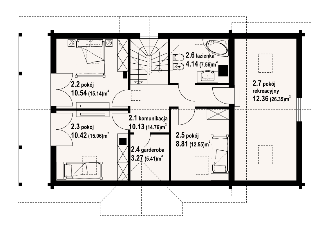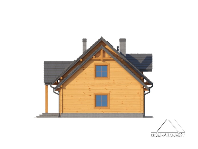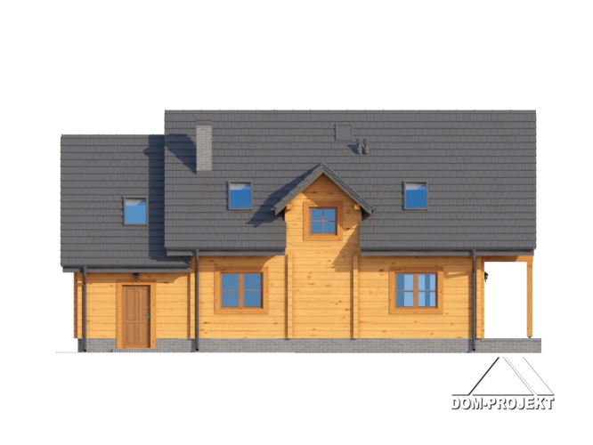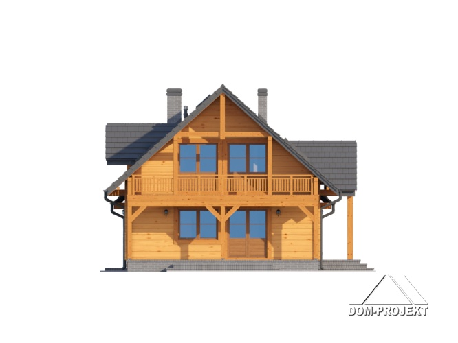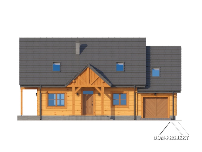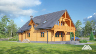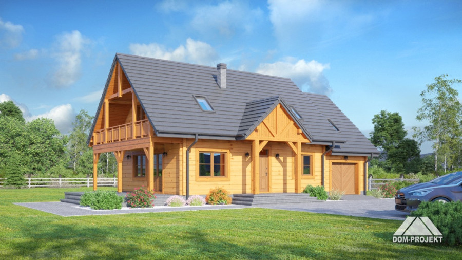 Dom z bali drewnianych. Duży salon z aneksem kuchennym, kominkiem i wyjściem na taras. Pokój. łazienka, komunikacja, wiatrołap, garaż, kotłownia. Na poddaszu cztery pokoje, łazienka, garderoba, komunikacja i balkon. Zwarta bryła budynku i dach dwuspadowy sprzyjają szybkie i taniej budowie i niskim kosztom eksploatacji.