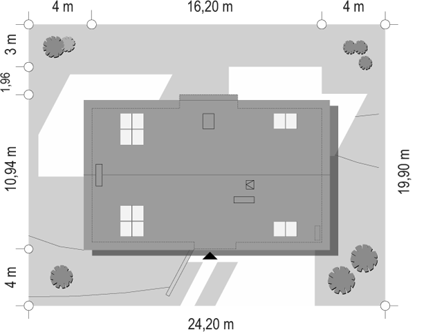 Wygodny dom z poddaszem użytkowym. Siedem pokoi, dwie łazienki, aneks kuchenny, wiatrołap, kotłownia, garaż. Duży salon z aneksem kuchennym, kominkiem, schodami na poddasze i wyjściem na taras. Na poddaszu pięć pokoi (w tym trzy z balkonem). Liczne wersje projektu.