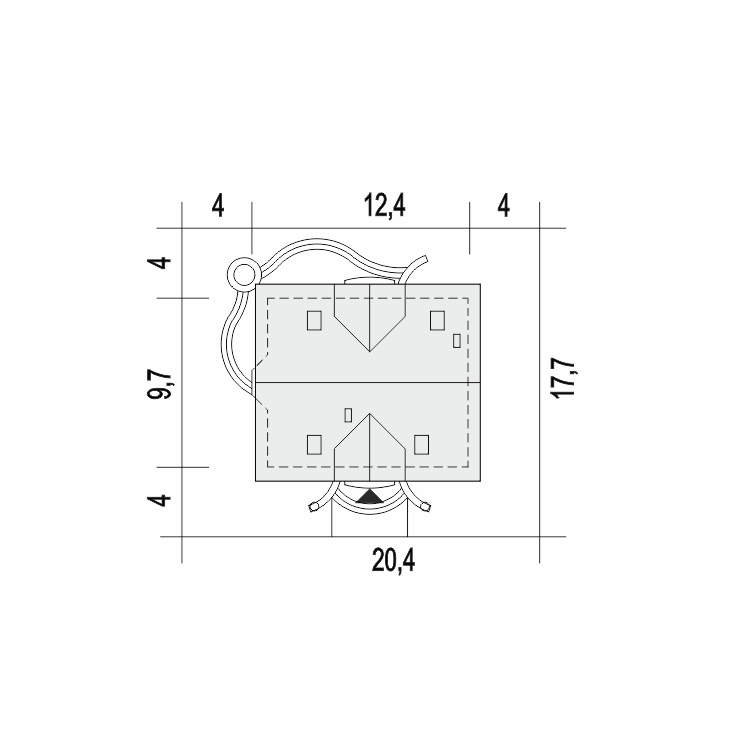 Dom z bali drewnianych. Duży salon z aneksem kuchennym, kominkiem, wyjściem na zadaszony taras i schodami na poddasze. Pokój, łazienka, wiatrołap, komunikacja, garaż i kotłownia. Na poddaszu cztery pokoje, łazienka i komunikacja. Trzy pokoje mają balkon. Zwarta bryła budynku i dach dwuspadowy sprzyjają taniej i szybkiej budowie i niskim kosztom eksploatacji.