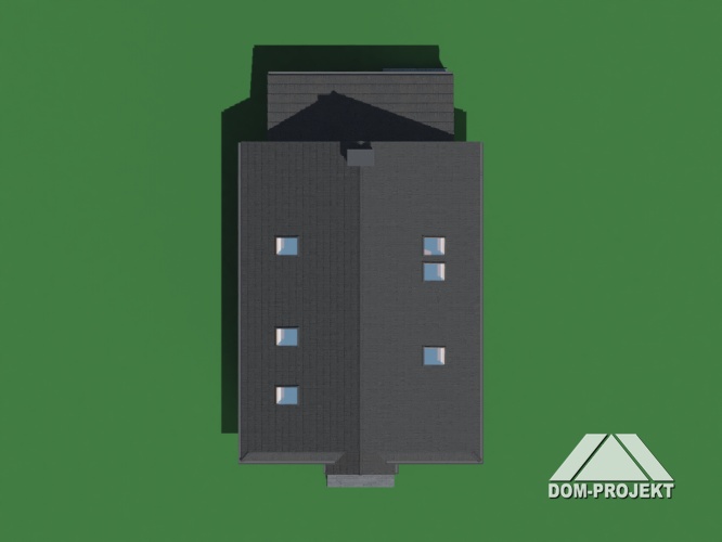 Dom w konstrukcji szkieletu drewnianego. Duży salon z aneksem kuchennym, kominkiem, schodami na poddasze i wyjściem na taras. Pokój, łazienka, wiatrołap, garaż i kotłownia. Na poddaszu dwa pokoje, łazienka, garderoba, komunikacja i dwa balkony. Zwarta bryła budynku i dach dwuspadowy sprzyjają szybkiej i taniej budowie i niskim kosztom eksploatacji.