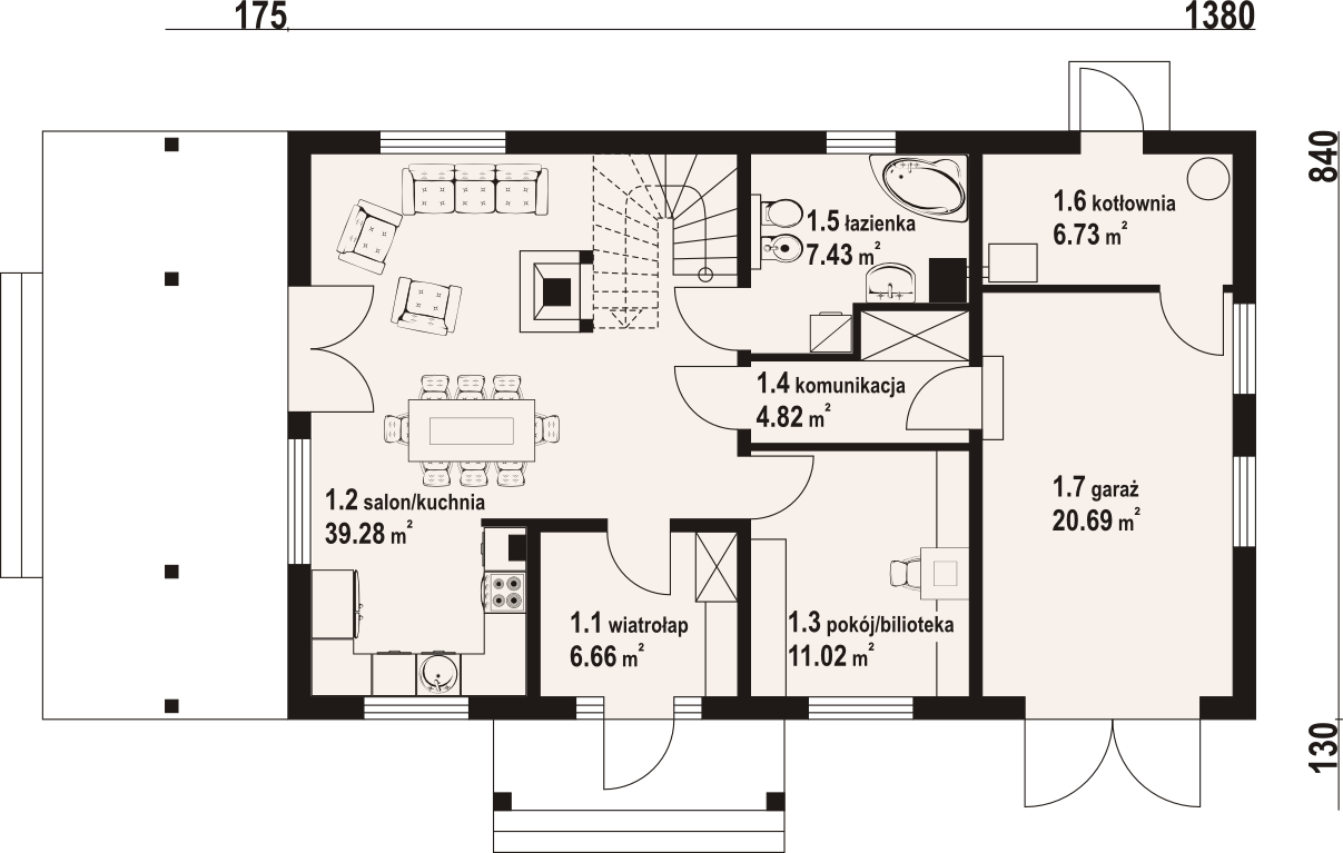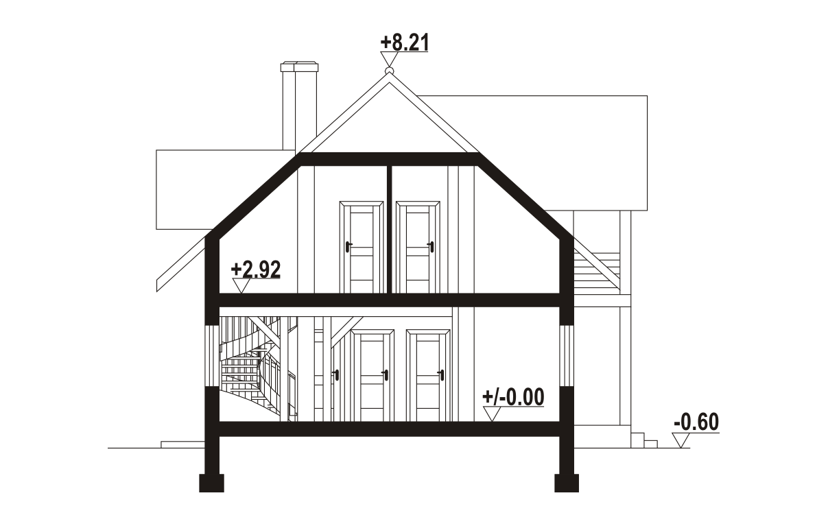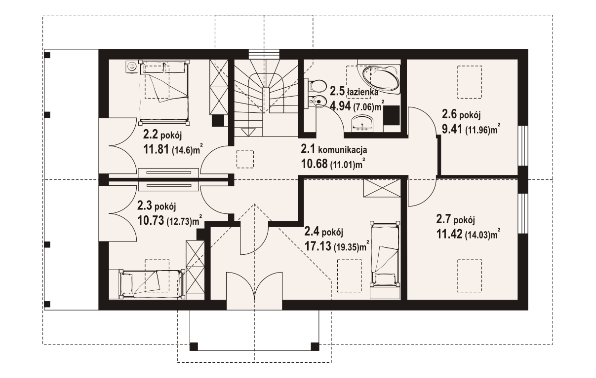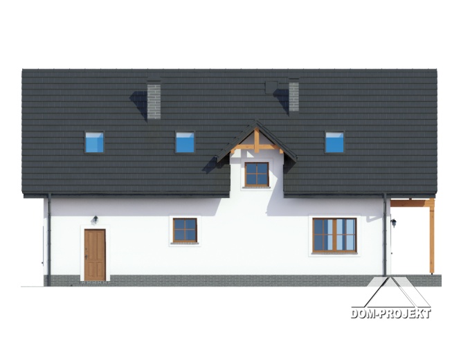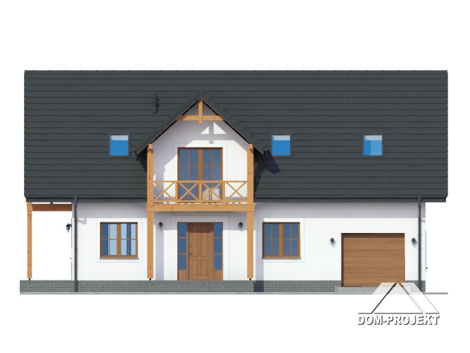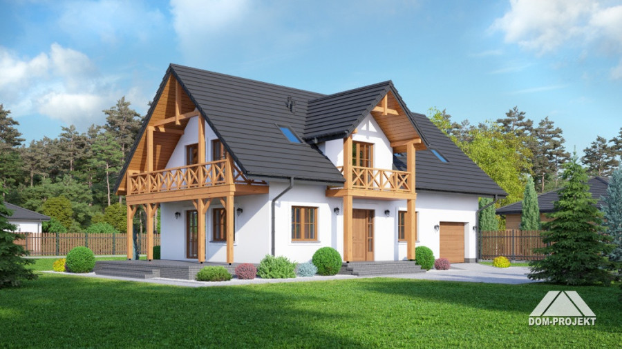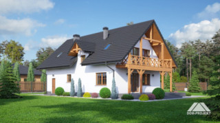 Dom w konstrukcji szkieletu drewnianego. Duży salon z aneksem kuchennym, kominkiem, wyjściem na duży taras i schodami na poddasze. Pokój, łazienka, wiatrołap i komunikacja.Na poddaszu pięć pokoi, łazienka i komunikacja. Balkon. Zwarta bryła budynku i dach dwuspadowy sprzyjają szybkiej i taniej budowie i niskim kosztom eksploatacji.