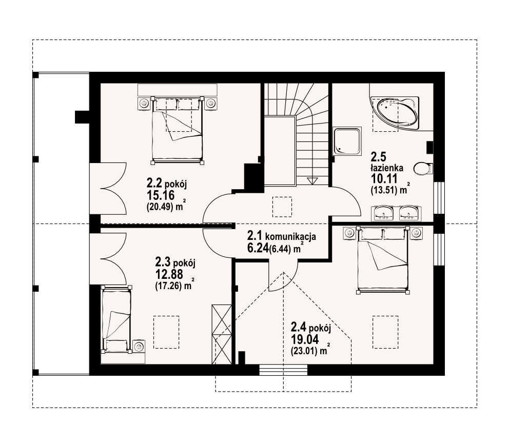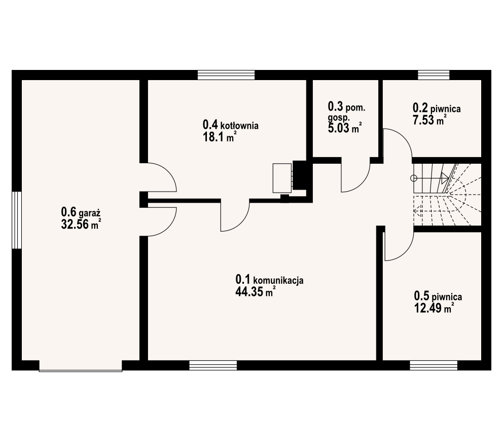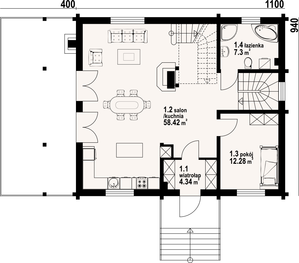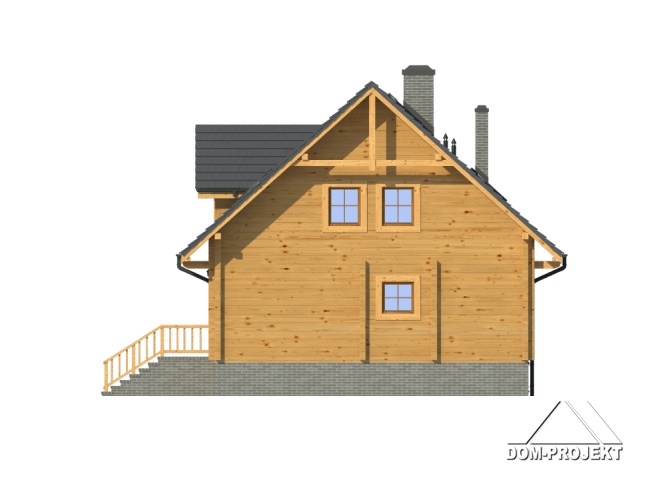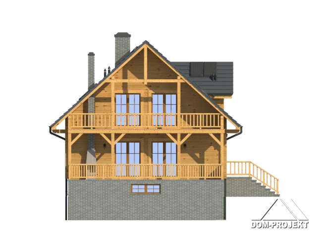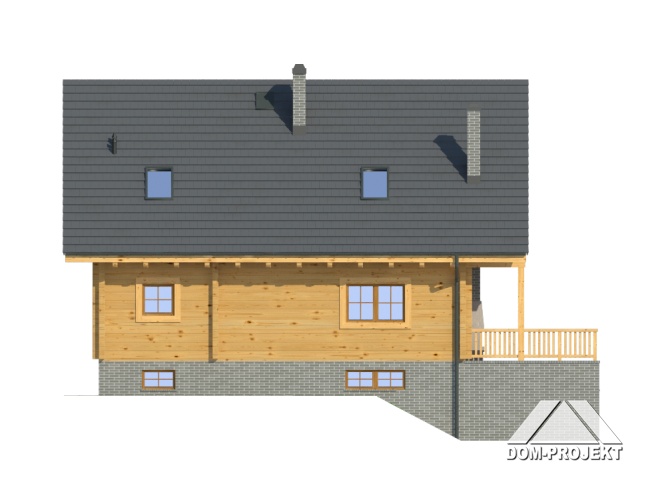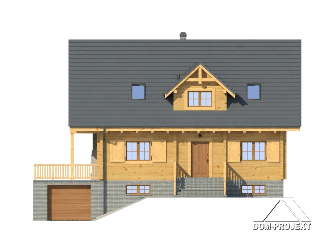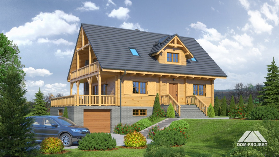 Dom z bali drewnianych. Na parterze duży salon z aneksem kuchennym, kominkiem, wyjściem na taras i schodami na poddasze. Pój, łazienka, wiatrołap i komunikacja. Na poddaszu trzy pokoje (dwa mają balkon), łazienka i komunikacja. W piwnicach garaż, kotłownia, piwnice i komunikacja. Zwarta bryła budynku i dach dwuspadowy sprzyjają taniej i szybkiej budowie i niskim kosztom eksploatacji.