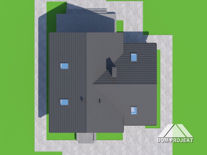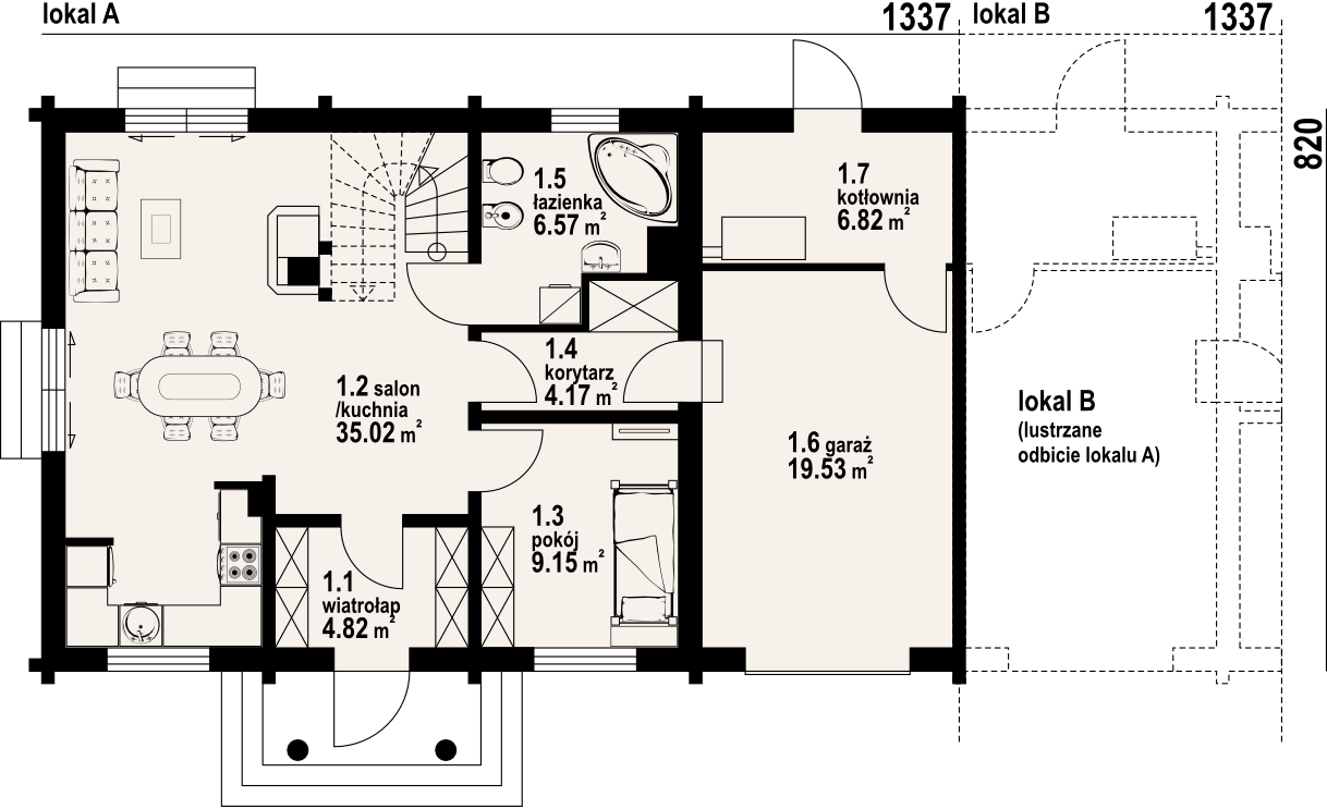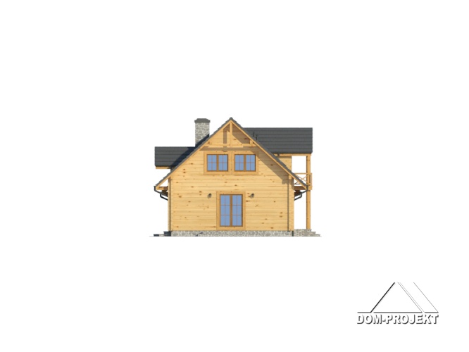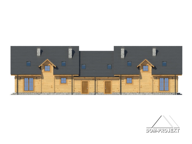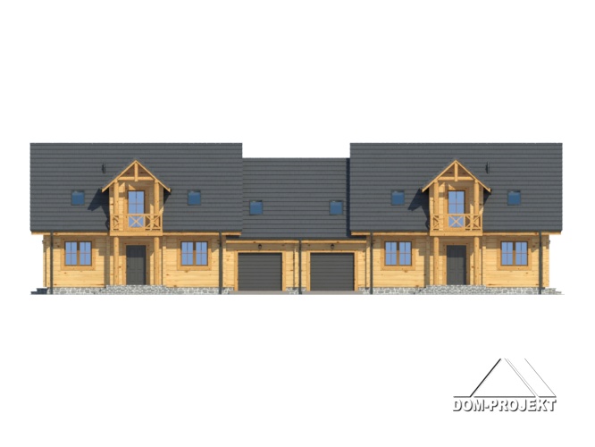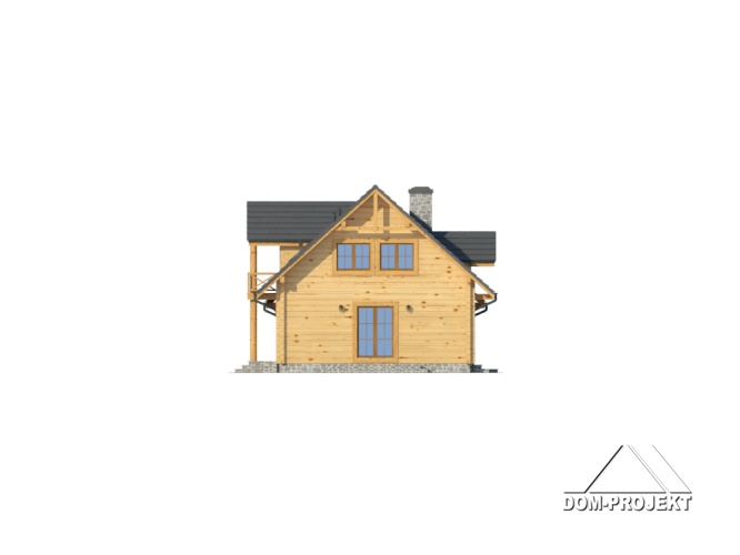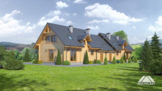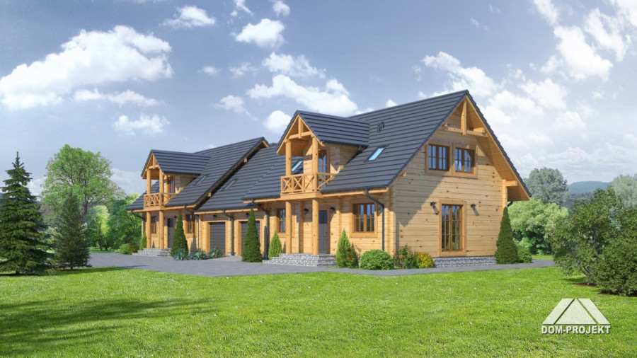 Dom z bali drewnianych składający się z dwu segmentów: A i B. W każdym segmencie: duży salon z aneksem kuchennym, kominkiem, wyjściem do ogrodu i schodami na poddasze. Pokój, łazienka, wiatrołap i korytarz z przejściem do garażu. Garaż i kotłownia. Na poddaszu pięć pokoi, łazienka i komunikacja, Balkon. Zwarta bryła budynku i dach dwuspadowy sprzyjają niskim kosztom budowy i eksploatacji.