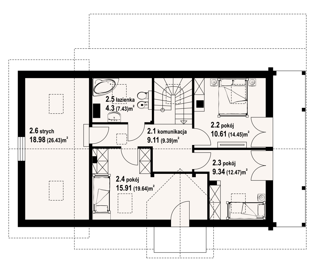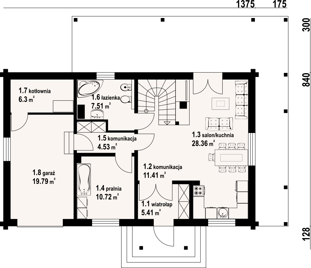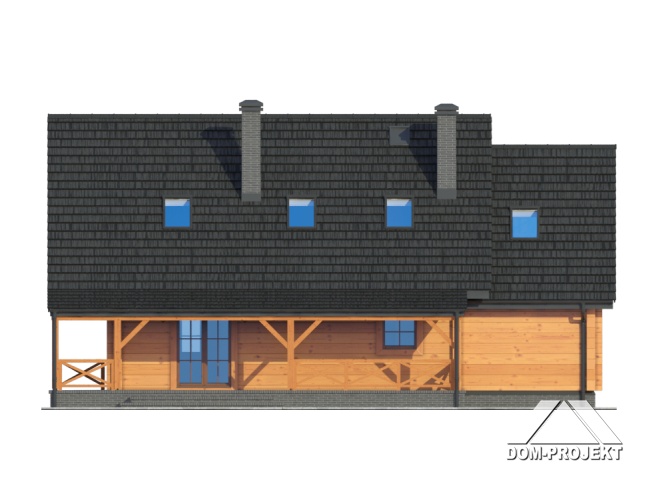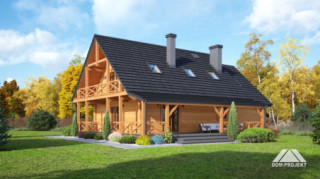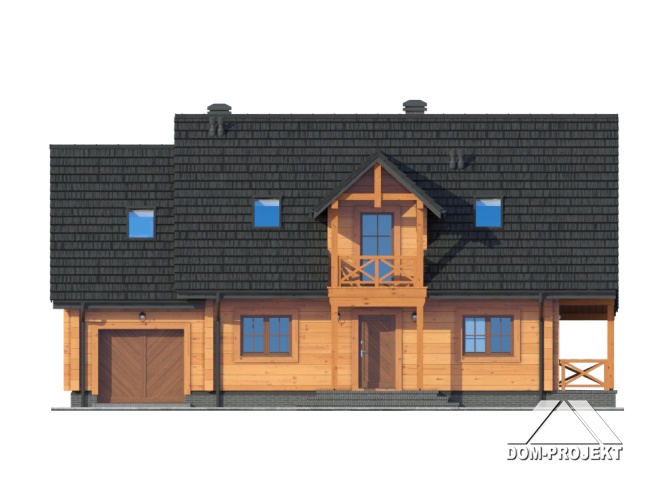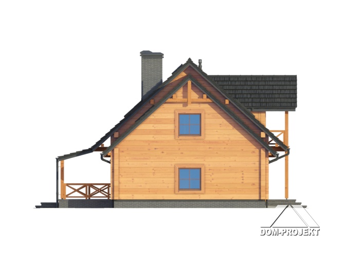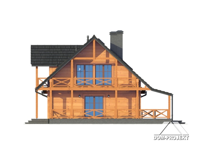 Dom z bali drewnianych. Duży salon z aneksem kuchennym, kominkiem, wyjściem na zadaszony taras i schodami na poddasze. Łazienka, komunikacja, wiatrołap, pralnia, garaż i kotłownia. Na poddaszu trzy pokoje, dwa balkony, łazienka, komunikacja i strych. Zwarta bryła budynku i dach dwuspadowy sprzyjają szybkiej i taniej budowie i niskim kosztom eksploatacji.