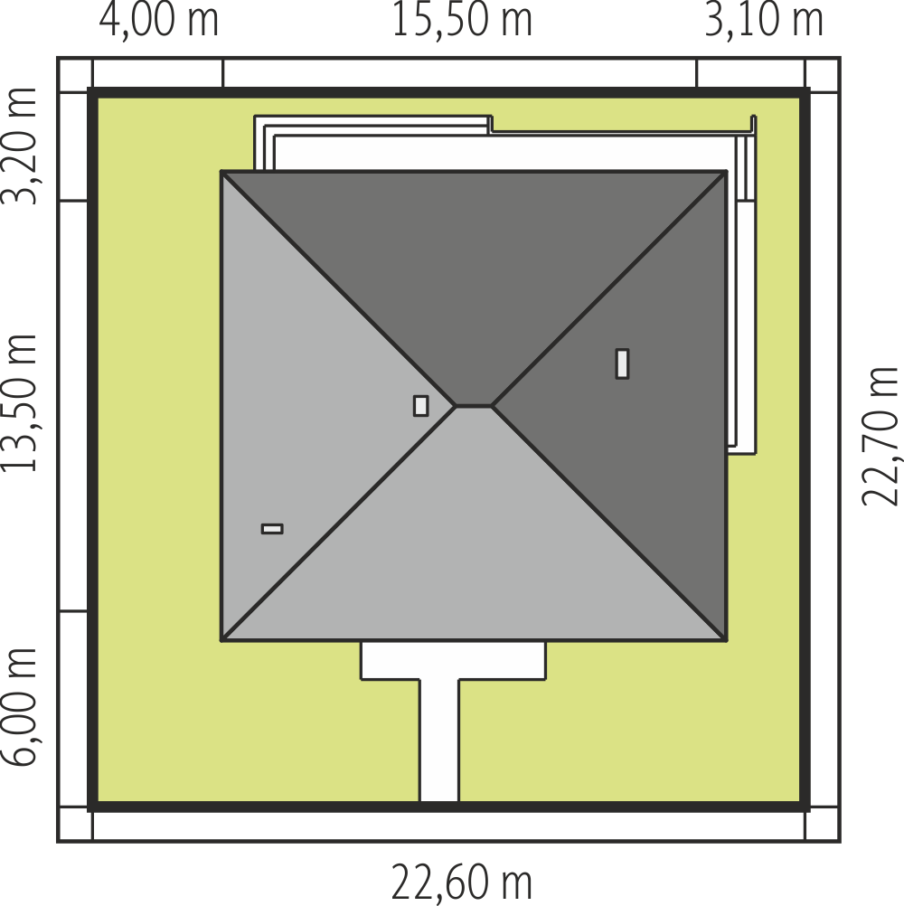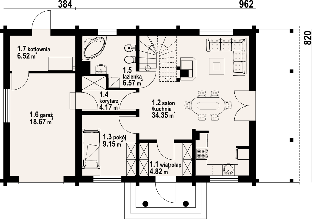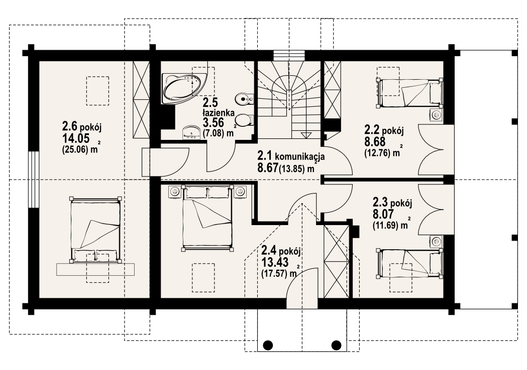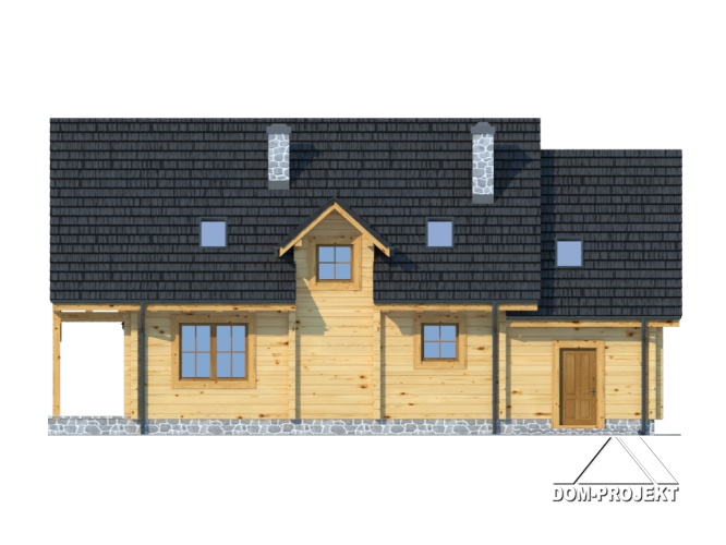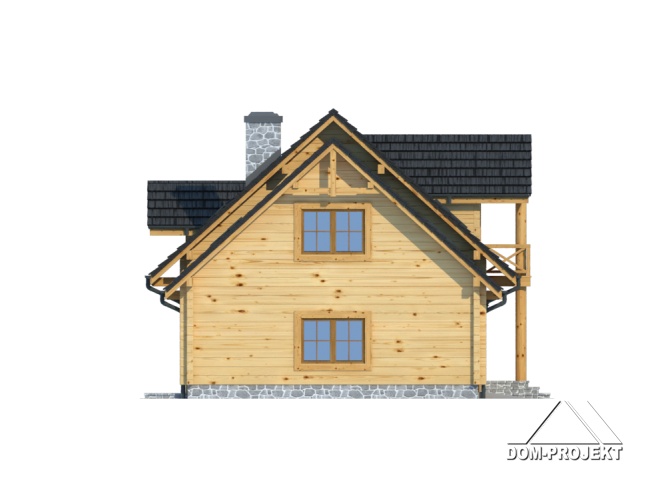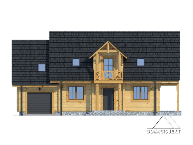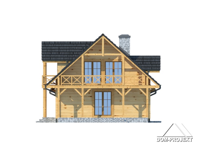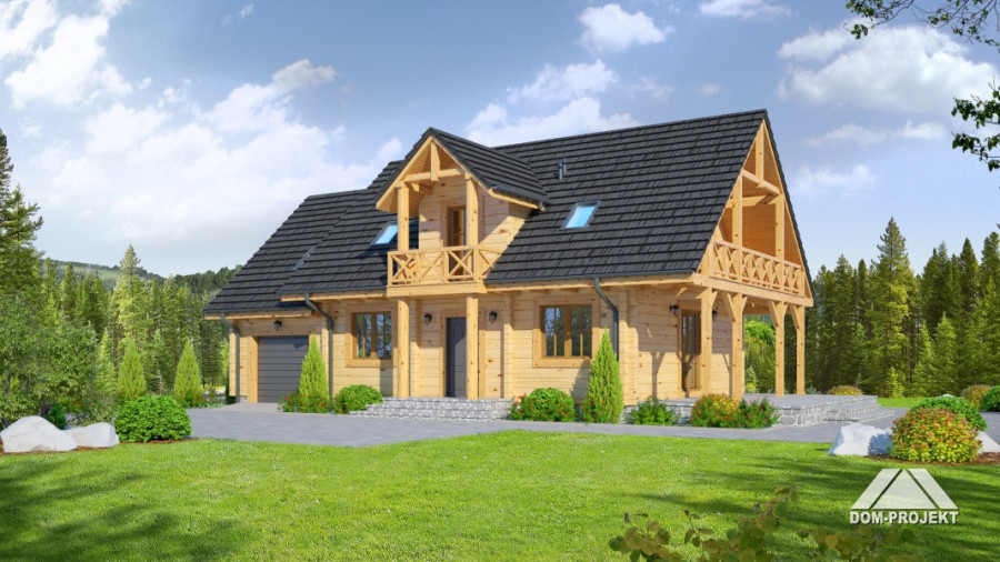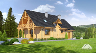 Dom z bali drewnianych. Duży salon z aneksem kuchennym, kominkiem, schodami na poddasze i wyjściem na duży taras. Pokój, łazienka, wiatrołap, korytarz, garaż i kotłownia. Na poddaszu cztery pokoje łazienka i komunikacja. Trzy pokoje poddasza mają balkon. Zwarta bryła budynku sprzyja szybkiej budowie i niskim kosztom eksploatacji.