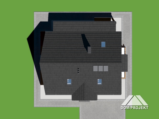 Na parterze znajduje się sień, hol i schody na poddasze, pod ich górnym biegiem umiejscowiono w.c. Po jednej stronie części komunikacyjnej zlokalizowano pokój dzienny, a po drugiej kuchnię z pomieszczeniem gospodarczym. Na poddaszu zaprojektowano 3 pokoje sypialne i łazienkę. Bryłę budynku stanowi prostopadłościan przykryty dachem dwuspadowym urozmaiconym daszkiem o kącie nachylenia połaci 45° urozmaiconym odchyleniem nad oknem łazienki oraz trójspadowym daszkiem tworzącym podcień wejścia. Pasy okładziny elewacyjnej są dodatkowym walorem plastycznym.