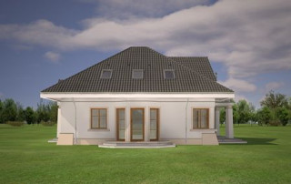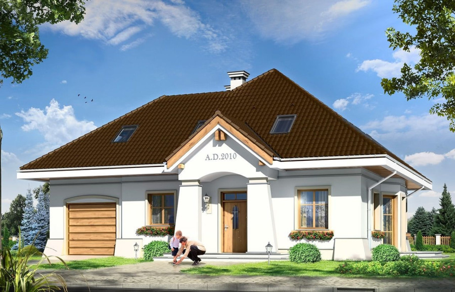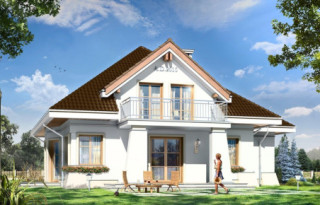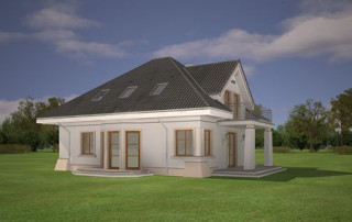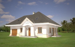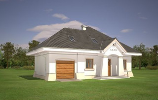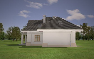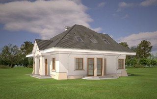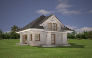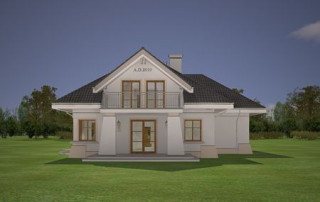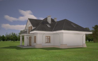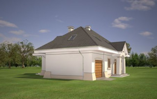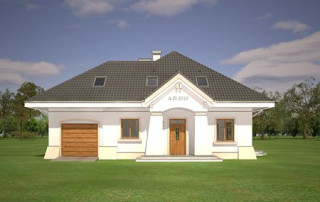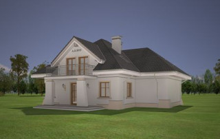 Projekt domu Figiel 2 jest wersją wariantową domu projektu domu Figiel. Willę zaprojektowano tym razem z garażem. Dom przeznaczony jest dla 4- 5-osobowej rodziny. Projekt domu Figiel 2 to parterowy dom z poddaszem użytkowym zaprojektowany na planie prostokąta, z dobudowanym garażem. Przekryty został czterospadowym dachem, z dodatkowymi lukarnami i dachem nad garażem. Wygląd zewnętrzny domu kojarzy się z przedwojenną rezydencją budowaną w miastach-ogrodach lub w podmiejskich letniskach. Jednocząc historyczny detal w elewacjach z nowoczesnymi materiałami i rozwiązaniami budowlanymi uzyskano bardzo ładny styl. Ganek wejściowy z przyporowymi kolumnami, przypory w narożnikach i pasy podmurówki, balkon w elewacji ogrodowej na przyporowych kolumnach - wszystkie te elementy potęgują efekt stabilnego osadzenia się domu w otaczający teren. Dzięki temu budynek wygląda bardzo statecznie. Wnętrze Figla 2 podzielono na część dzienną na parterze i sypialnie na poddaszu. Na parterze opracowano: salon z aneksem jadalnym z pięknym wykuszem, oraz centralnie ustawionym kominkiem, hol - z ładnymi dwubiegowymi schodami, częściowo otwarta kuchnia, oraz dodatkowy pokój, mogący służyć jako gabinet lub sypialnia. Dodatkowo obok przedsionka znajdują się: obszerne pomieszczenie gospodarcze - kotłownia, wc z natryskiem, oraz garaż. Na poddaszu znajdują się trzy sypialnie z jedną dużą wspólną łazienką oraz dodatkowa garderoba. Na półpiętrze nad garażem zaprojektowano strych, który można łatwo zaadaptować na dodatkowy pokój lub pokój sportowy. Pracownia posiada odbicie lustrzane projekt domu Figiel 2.