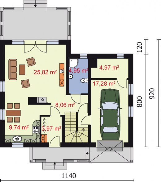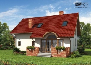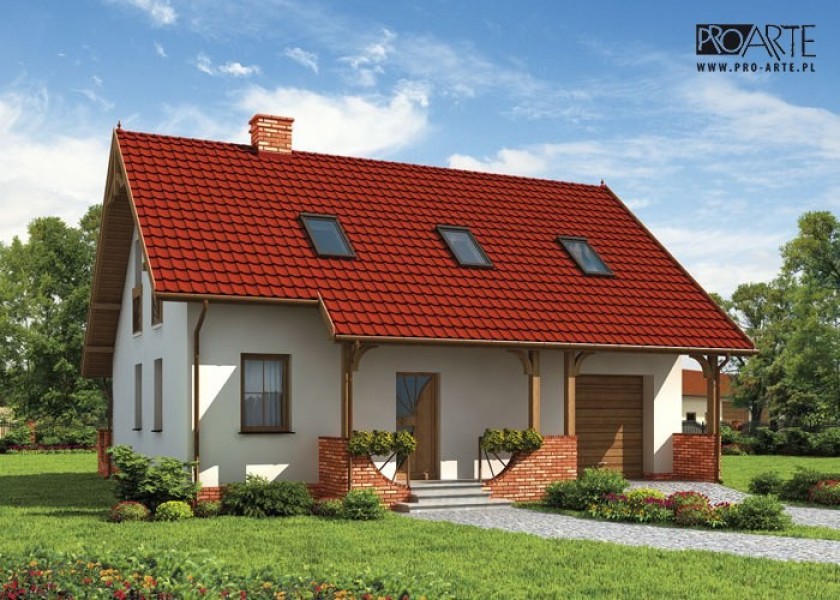 Miranda To niezwykły dom, który da nowym właścicielom poczucie wygody i bezpieczeństwa. Już od frontu odkrywa mnóstwo zalet, które będą powodem do szczycenia się nim! Pierwszym rzucającym się w oczy elementem jest solidny murek, który niczym czerwony dywan wskazuje nam drogę, którą mamy podążać. Dodatkowo widok ten został wzbogacony o zadaszenie, będące przedłużeniem powierzchni dachu, które osłania drzwi wejściowe oraz –co jest raczej rzadkością- wjazd do garażu! Wszystko to sprawi, ze goście chętniej będą pukać do Twych drzwi, gdyż tak wspaniale prezentujące się wejście musi być zapowiedzią równie niepowtarzalnego wnętrza.