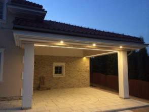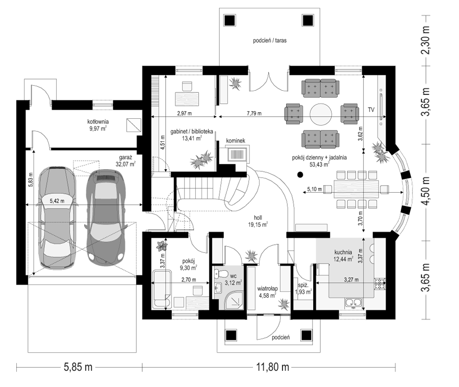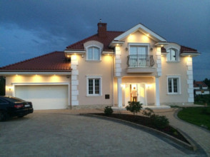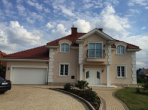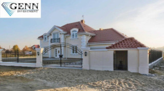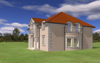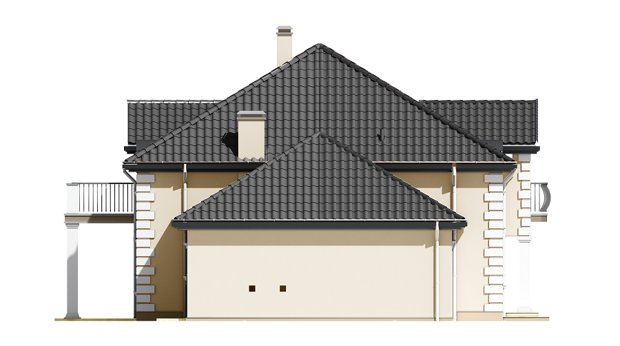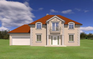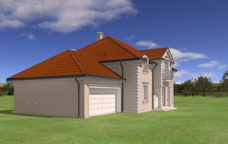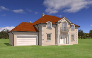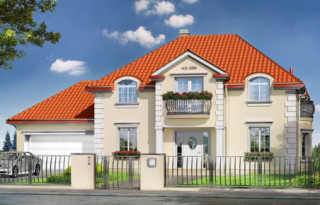 Projekt domu Magnat to reprezentacyjna stylowa willa, nawiązująca do stylistyki dworków i willi międzywojennych. Projekt domu Magnat swój ponadczasowy styl łączy z nowocześnie i funkcjonalnie zaprojektowanym wnętrzem. Dom jest prostokątną, parterową bryłą z poddaszem użytkowym oraz dobudowaną częścią garażową. Budynek został przekryty czterospadowym dachem. Na elewacji frontowej i ogrodowej zaprojektowano dwukondygnacyjne portale, podparte kolumnami, zakończone dwuspadowymi zdobionymi frontonami. Pomimo tego, że główna bryła budynku jest parterowa, poddasze ma bardzo wysoką ścianę kolankową, także prawie cała powierzchnia podłogi górnej kondygnacji jest użytkowa - powyżej wysokości stania człowieka. Wnętrze domu Magnat zaprojektowano wydzielając na parterze dużą przestrzeń dzienną: salonu, jadalni, holu i częściowo otwartej kuchni. Salon z jadalnią mają obniżoną o dwa stopnie podłogę, przez co pomieszczenia te zyskują na wysokości. Piękne reprezentacyjne schody w holu widoczne są również z pokoju dziennego i jadalni. Na parterze mieści się też gabinet - biblioteka (można go zaadaptować na dodatkowy pokój z wejściem z holu) i dodatkowy pokój - na przykład sypialnia. W część gospodarczej mieści się wygodny garaż i duża kotłownia. Na poddaszu przewidziano cztery sypialnie, z apartamentem rodziców, posiadającym własną łazienkę i garderobę, oraz wyjście na taras ogrodowy na piętrze. Pracownia posiada też wersję w standardzie NF40 oraz wersję odbicia lustrzanego projektu Magnat. Zapraszamy do zapoznania się z pełną ofertą pracowni MG Projekt tej serii: projekt domu Magnat 2, projekt domu Magnat 3, projekt domu Magnat 4.