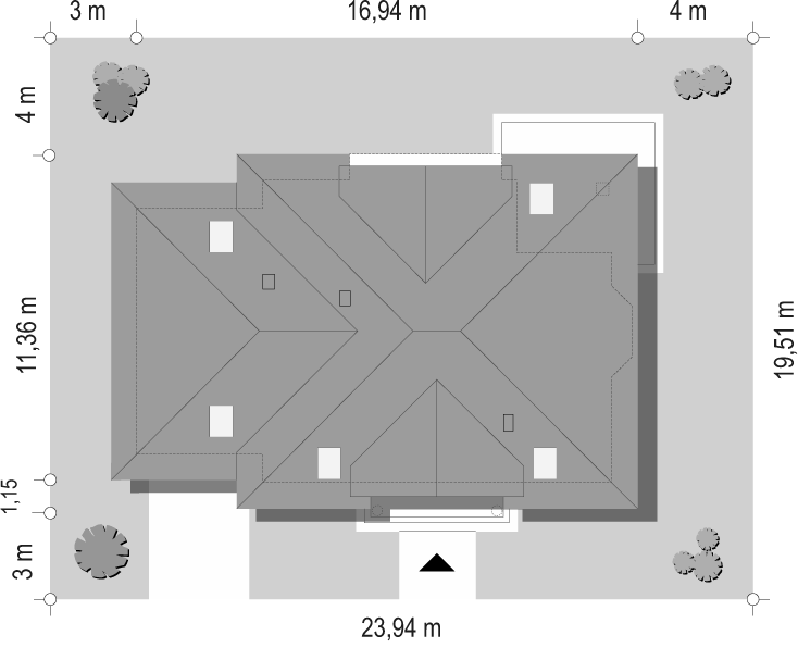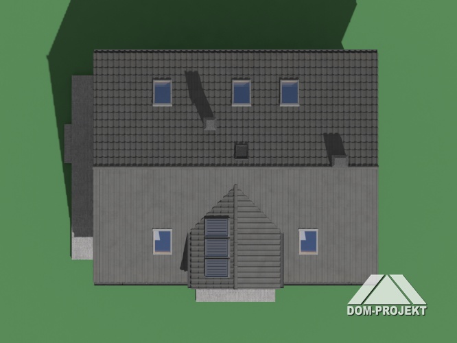 Dom z użytkowym poddaszem i wkomponowanym w bryłę garażem dwustanowiskowym z kotłownią. Na parterze znajduje się salon, obok niego kuchnia z spiżarką. Jest tu także dodatkowy pokój oraz łazienka. Z domu zaprojektowano przejście do garażu. Poddasze to cztery sypialnie, w tym jedna z garderobą i łazienka.
