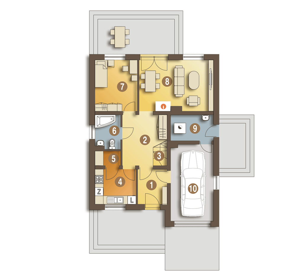 Projekt domu Miła II to propozycja do 4-5 osobowej rodziny. Na parterze lokalizowano pokój gościnny, salon z kuchnia i jadalnią, komunikację, łazienkę oraz pomieszczenia pomocnicze jak garaż i kotłownia. Na piętrze mamy trzy wygodne sypialnię, przedpokój, łazienkę i garderobę. Miła II to niewielki domek o atrakcyjnym, tradycyjnym wyglądzie zewnętrznym.fundamenty: BETONOWE ściany zewnętrzne: POROTHERM +STYROPIAN TERMO ORGANIKA rodzaj stropu: TERIVA I elewacje: TYNK STRUKTURALNY pokrycie dachu: DACHÓWKA CEM. lub CER.
