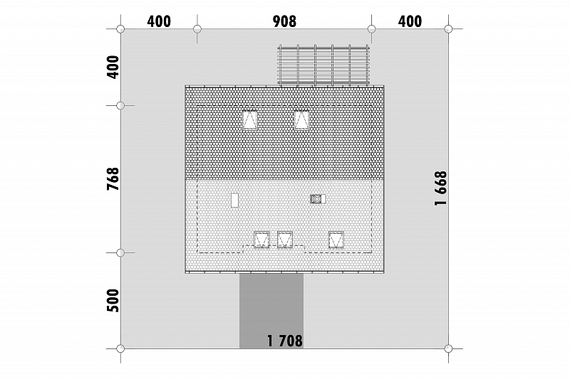 Dom w konstrukcji szkieletu drewnianego. Salon z aneksem kuchennym i wyjściem na taras. Dwa pokoje, łazienka, wiatrołap i kotłownia. Poddasze nieużytkowe. Wyjście na poddasze rozkładanymi schodami strychowymi. Zwarta bryła budynku i dach dwuspadowy sprzyjają szybkiej i taniej budowie i niskim kosztom eksploatacji.