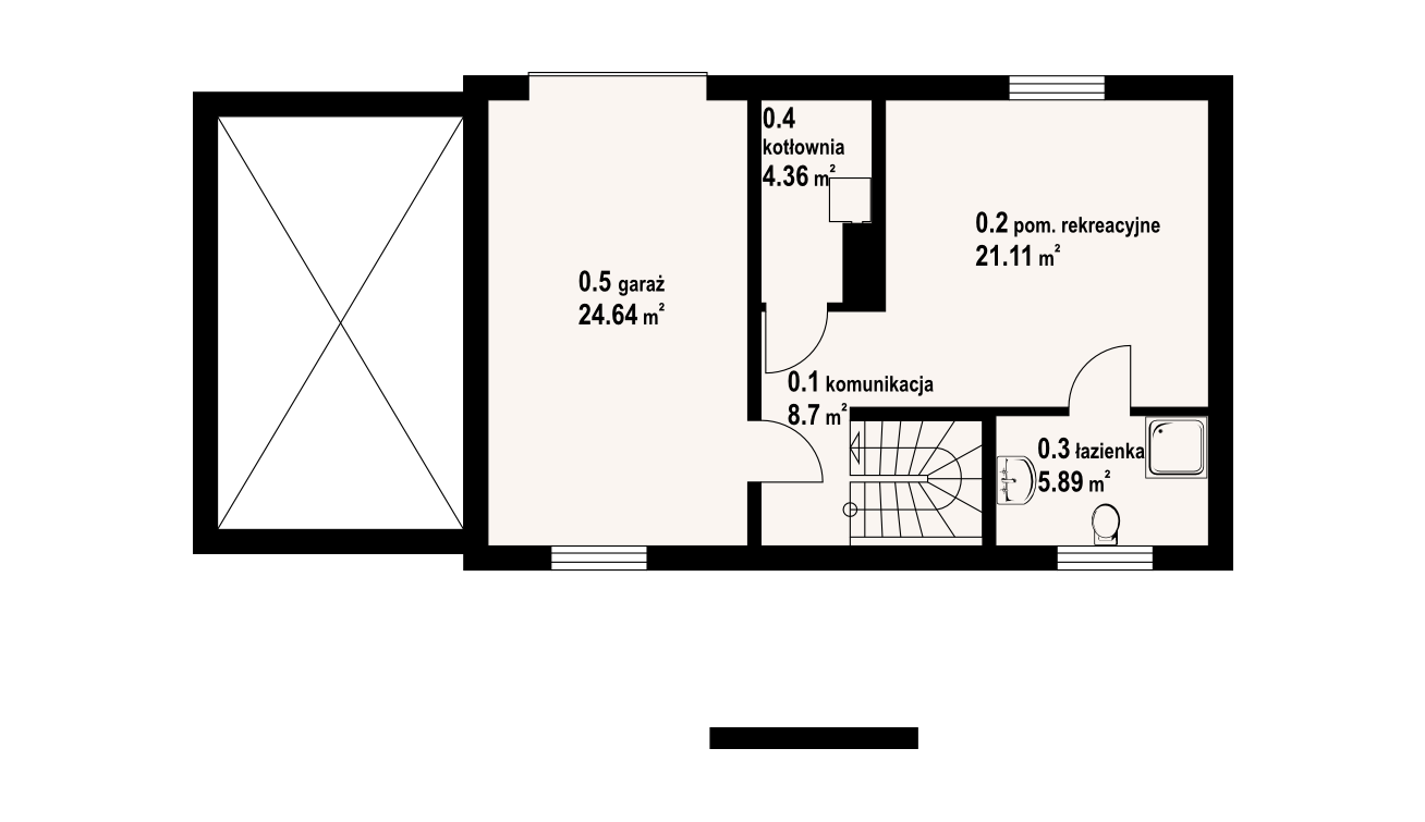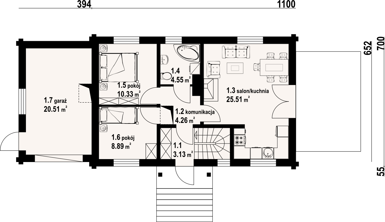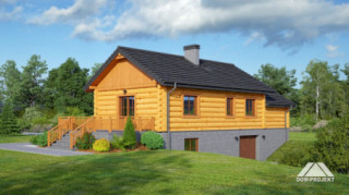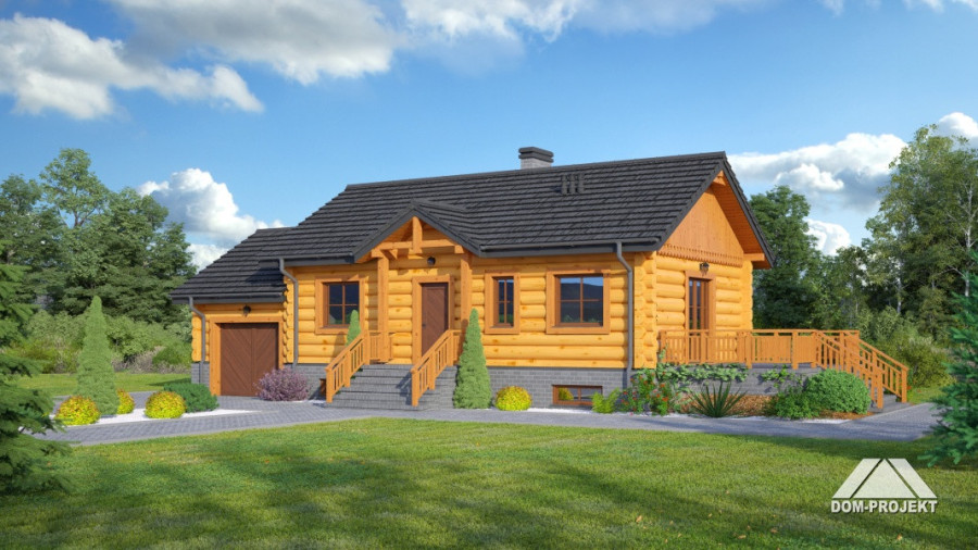 Dom z bali drewnianych. Parterowy, podpiwniczony. Duży salon z aneksem kuchennym, kominkiem i wyjściem na taras. Dwa pokoje, łazienka, komunikacja, wiatrołap i garaż. W piwnicach garaż, kotłownia, pomieszczenie rekreacyjne, łazienka i komunikacja.Zwarta bryła budynku i dach dwuspadowy sprzyjają taniej i szybkiej realizacji i niskim kosztom eksploatacji.