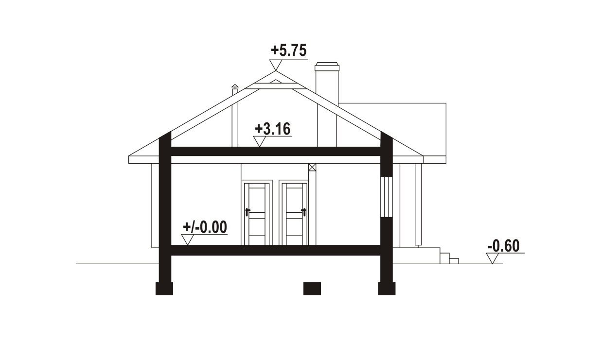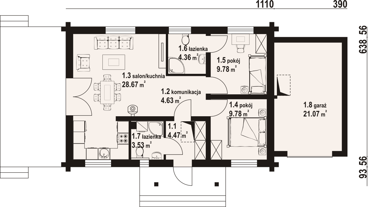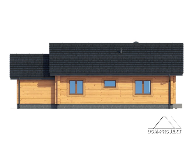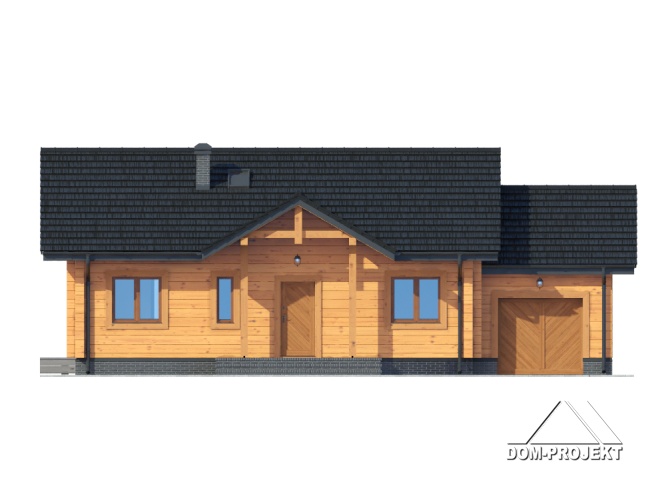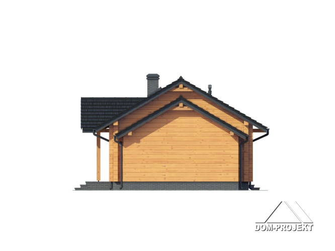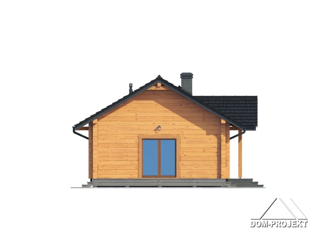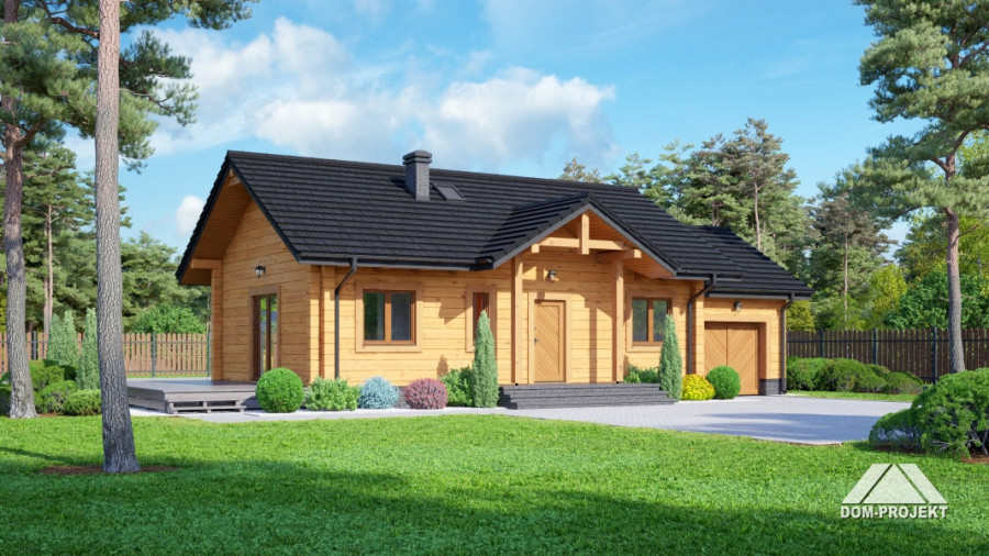 Dom parterowy w konstrukcji bala drewnianego. Duży salon z aneksem kuchennym, kominkiem i wyjściem na taras. Dwa pokoje, dwie łazienki, wiatrołap i komunikacja. Wyjście na poddasze schodami strychowymi rozkładanymi.