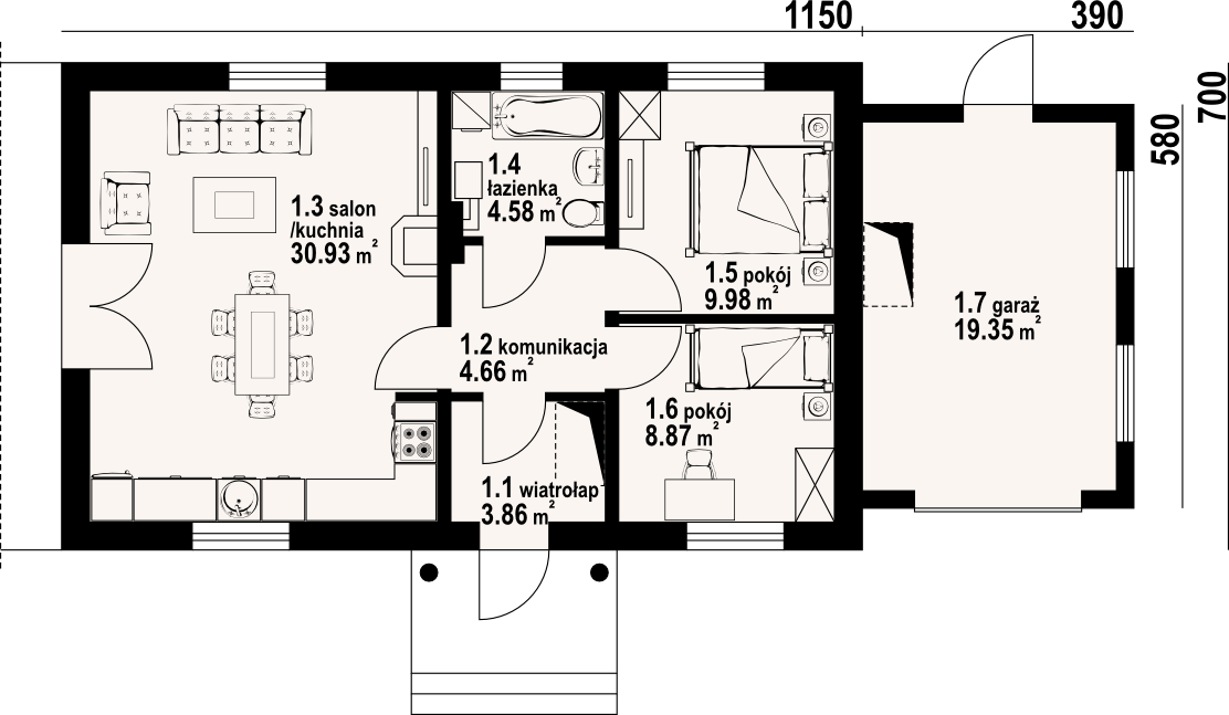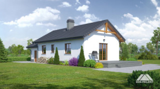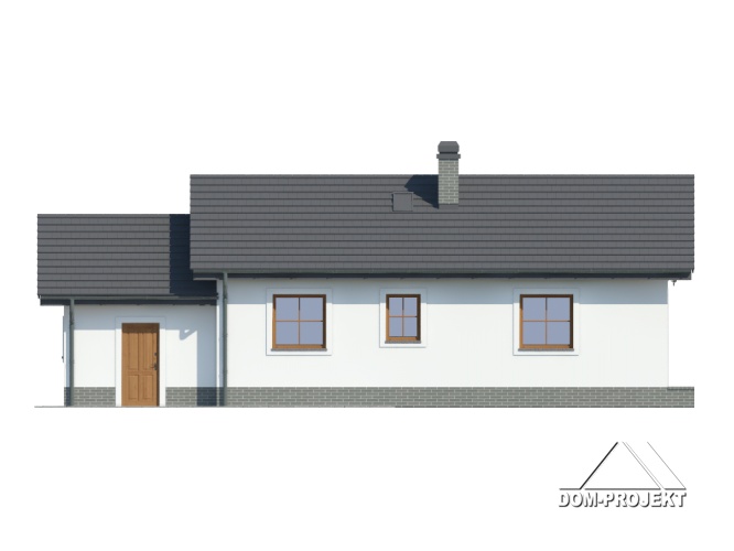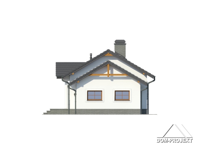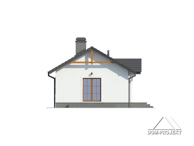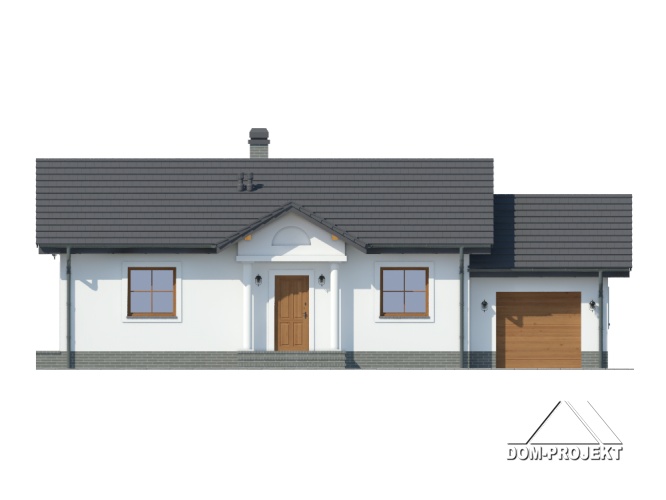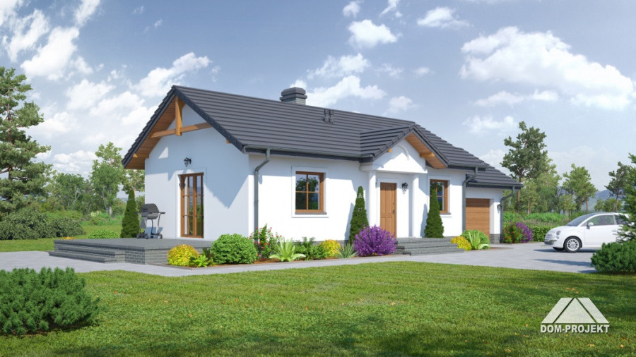 Mały dom parterowy na wąską działkę. Duży salon z aneksem kuchennym, kominkiem i wyjściem na taras. Dwa pokoje, łazienka, komunikacja, wiatrołap i garaż. Wyjścia na poddasze (strych) z garażu i wiatrołapu schodami rozkładanymi. Zwarta bryła budynku i dach dwuspadowy sprzyjają taniej i szybkiej budowie i niskim kosztom eksploatacji.