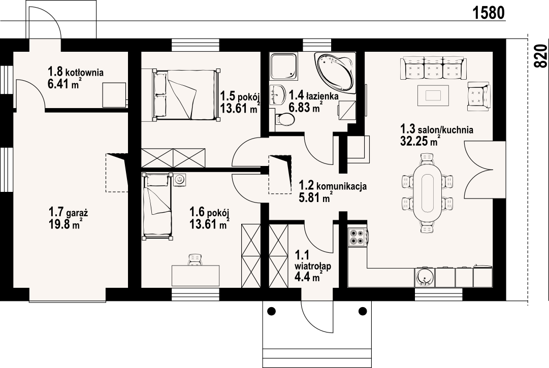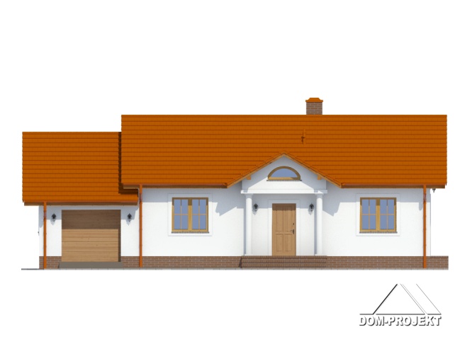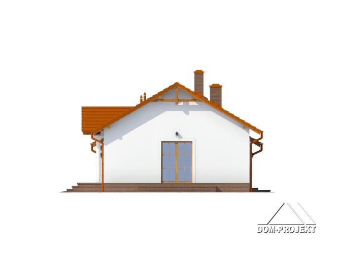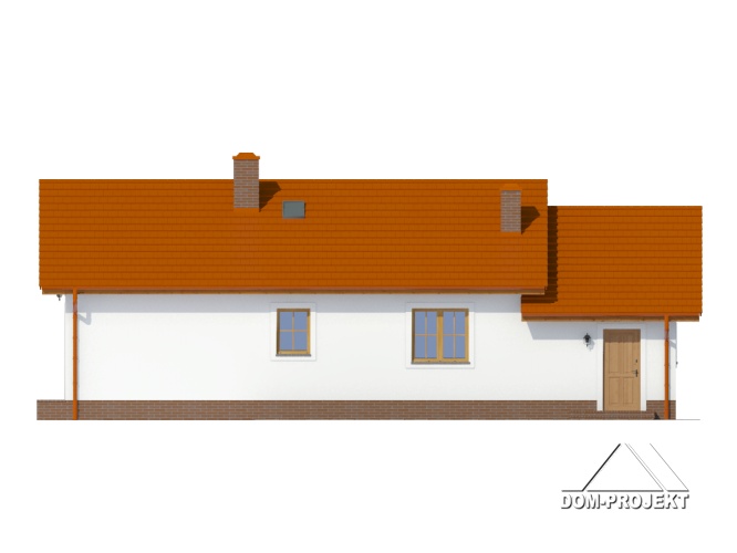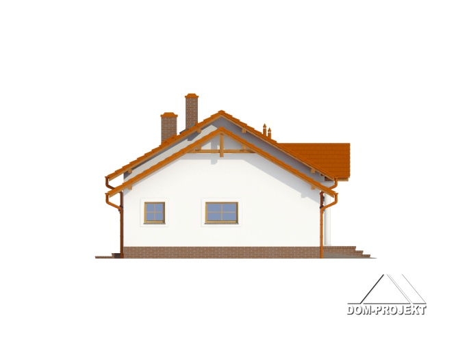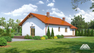 Dom parterowy. Duży salon z aneksem kuchennym, kominkiem i wyjściem na taras. Dwa pokoje, łazienka, korytarz i wiatrołap. Garaż i kotłownia. W garażu schody rozkładane na poddasze. Poddasze nieużytkowe. Prosta bryła budynku i dach dwuspadowy sprzyjają szybkiej i taniej budowie i niskim kosztom eksploatacji.