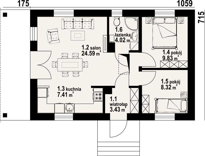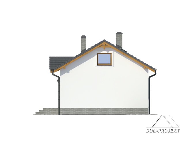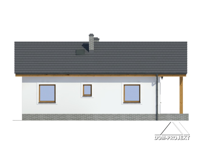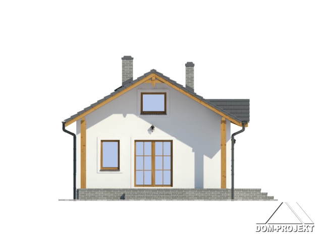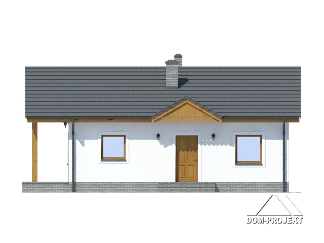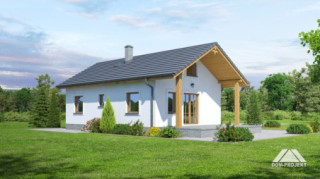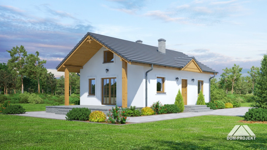 Parterowy dom jednorodzinny lub letniskowy. Salon z aneksem kuchennym, wyjściem na zadaszony taras i kominkiem. Dwa pokoje, łazienka, wiatrołap. Wejście na strych schodami rozkładanymi. Zwarta bryła budynku i dach dwuspadowy sprzyjają szybkiej i taniej budowie i niskim kosztom eksploatacji.