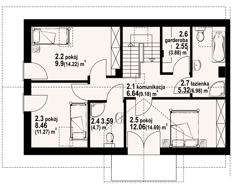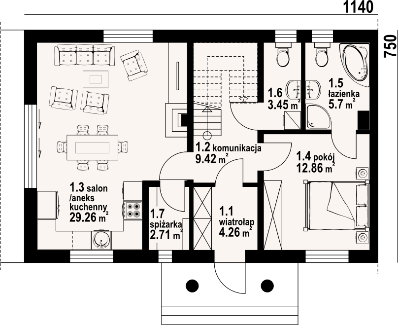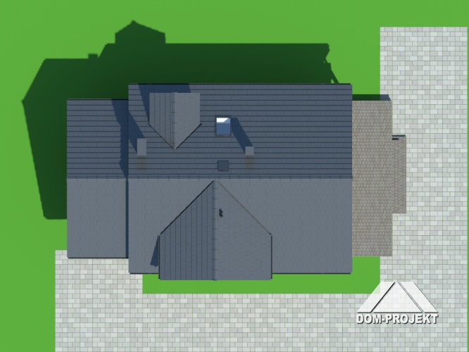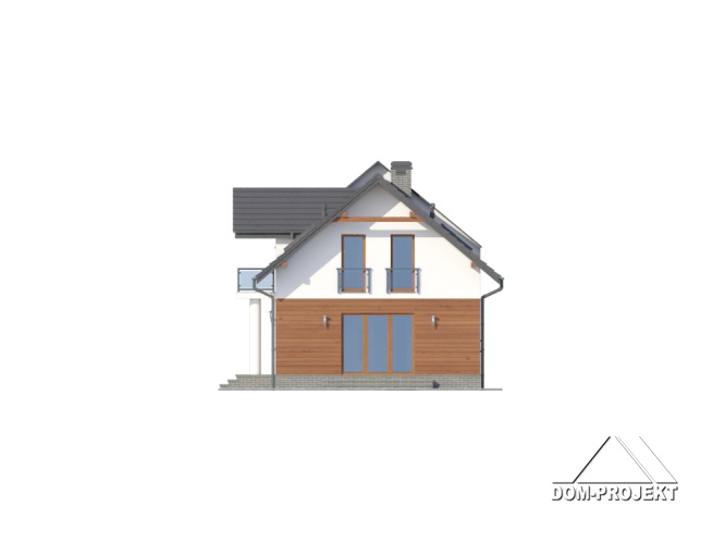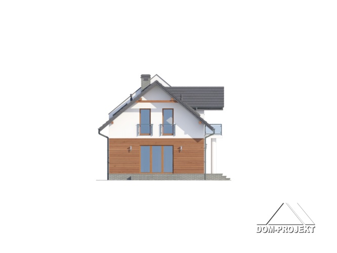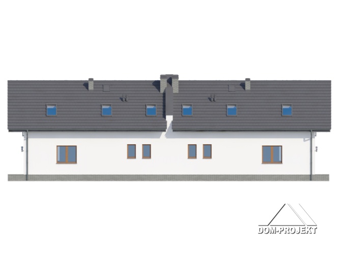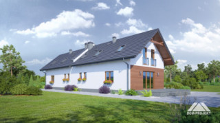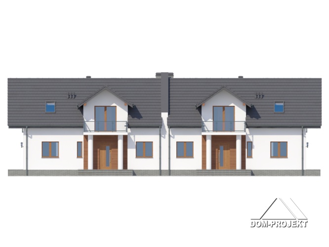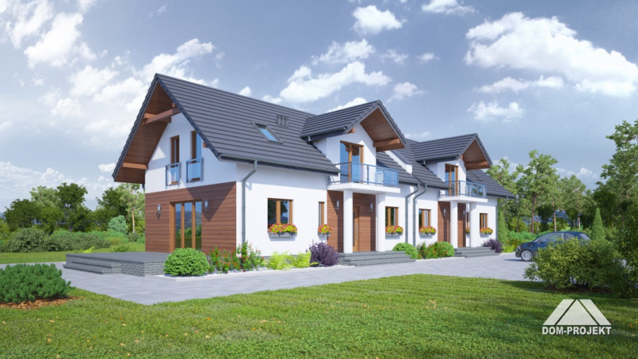 Dom- bliżniak. Każdy segment składa się z: dużego salonu z aneksem kuchennym, kominkiem i wyjściem na taras. Pokój z łazienką, wc, komunikacja, wiatrołap i spiżarka. Na poddaszu trzy pokoje, dwie łazienki, balkon, garderoba i komunikacja. Zwarta bryła budynku i dach dwuspadowy sprzyjają szybkiej i taniej budowie i niskim kosztom eksploatacji.