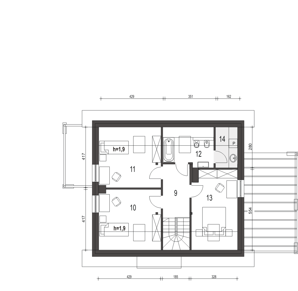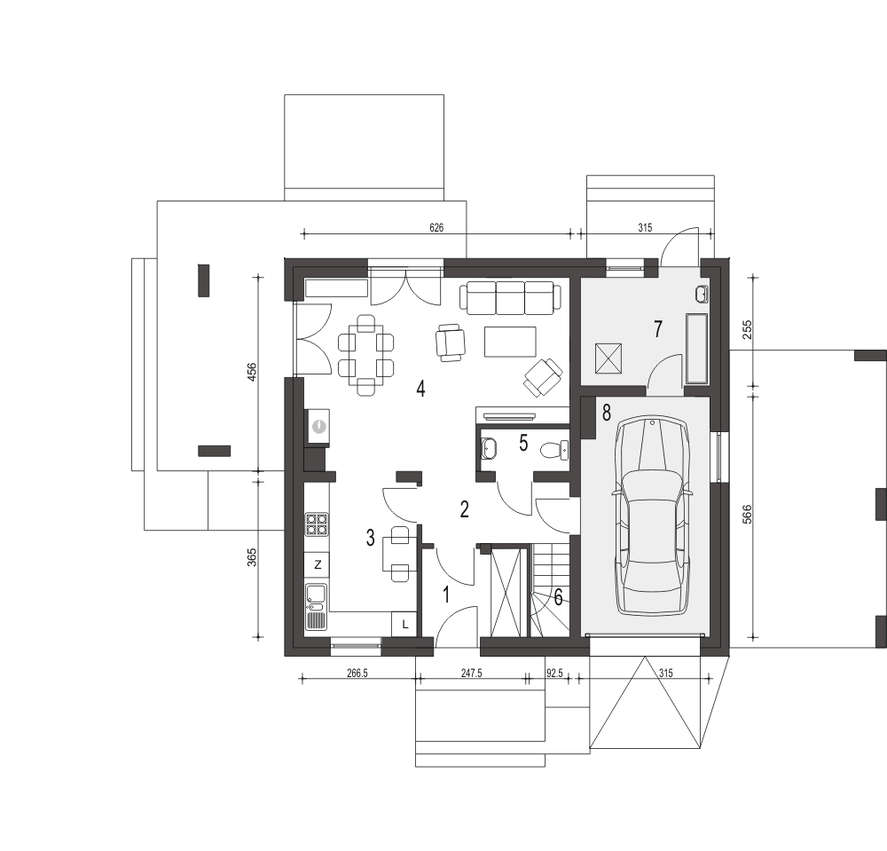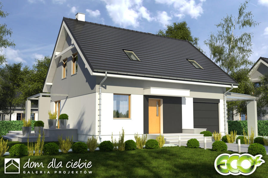 Projekt Monika II to prosty konstrukcyjnie, atrakcyjny, niewielki dom z poddaszem użytkowym dla 4-osobowej rodziny. Oprócz garażu posiada również dobudowaną wiatę na drugi samochód.