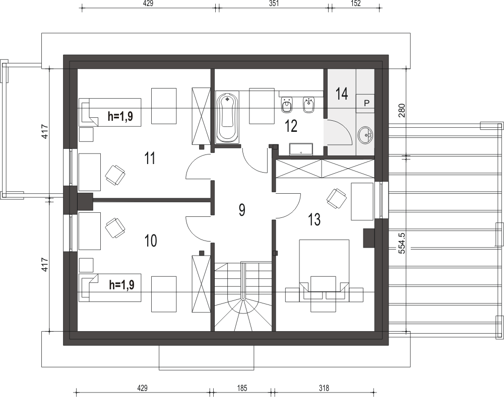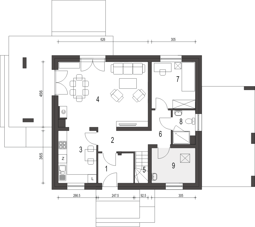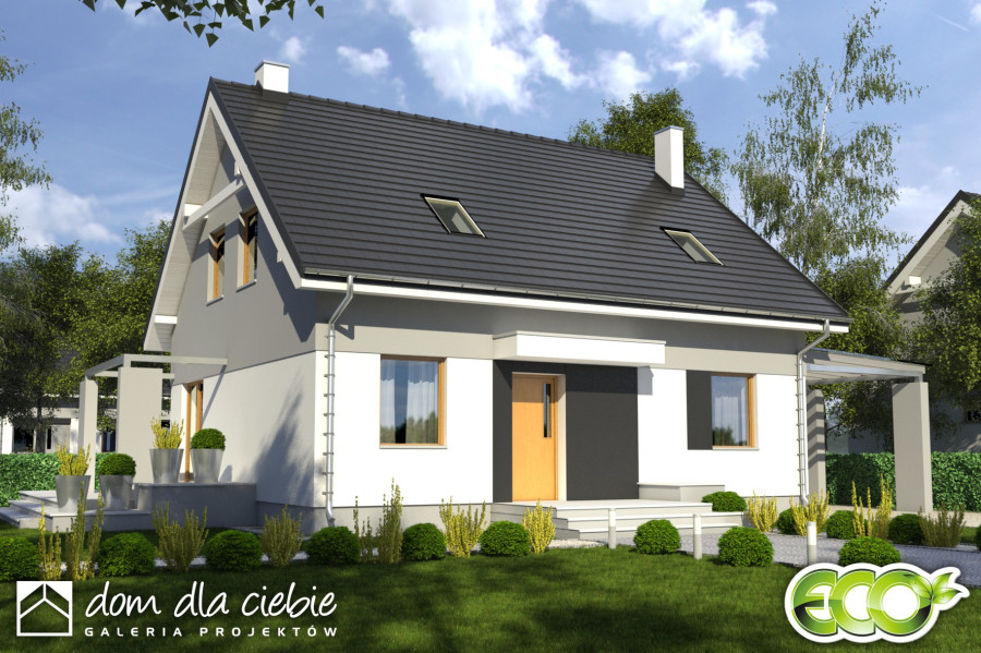 Projekt Monika II to prosty konstrukcyjnie, atrakcyjny, niewielki dom z poddaszem użytkowym i wiatą garażową dla 4-osobowej rodziny.fundamenty: BETONOWE ściany zewnętrzne: POROTHERM+STYROPIAN TERMO ORGANIKA rodzaj stropu: TERIVA I elewacje: TYNK STRUKTURALNY pokrycie dachu: DACHÓWKA CEM. lub CER.