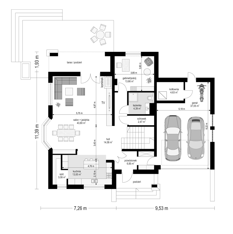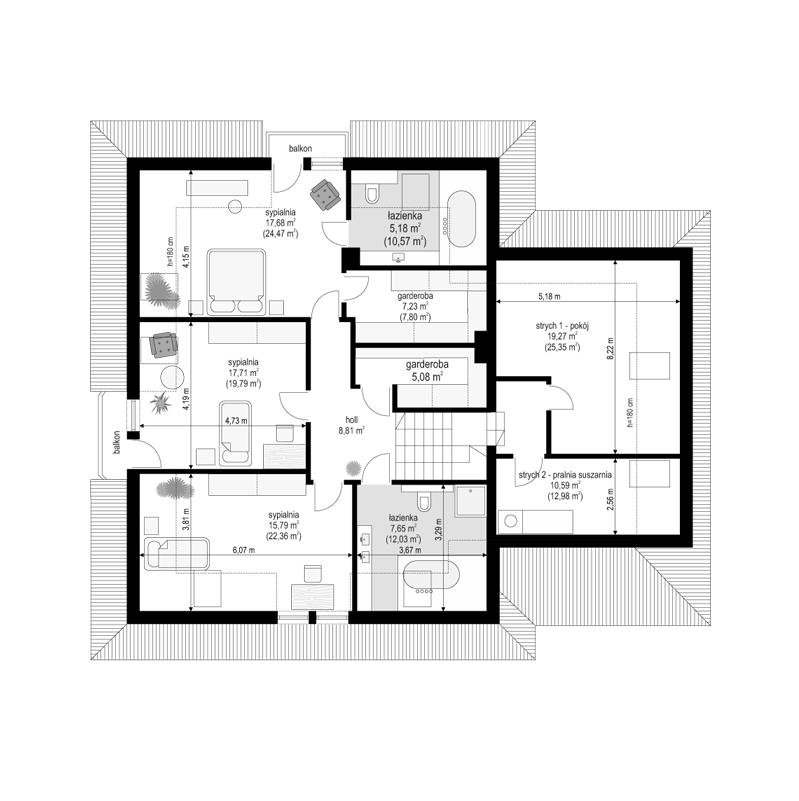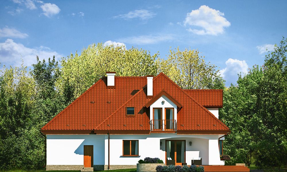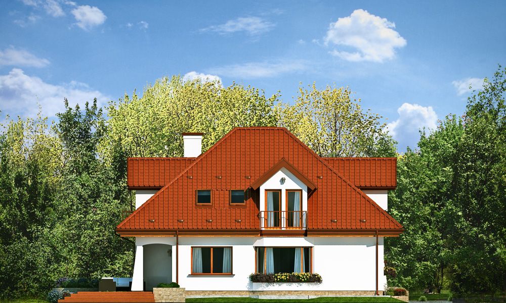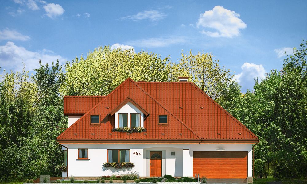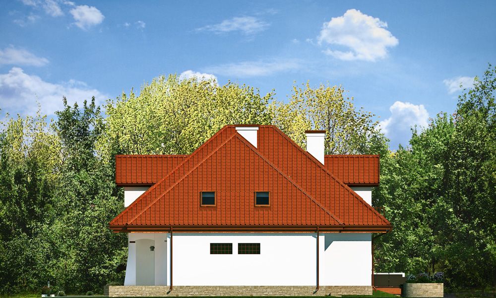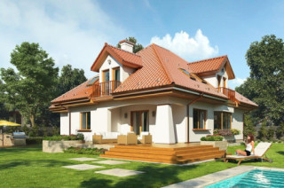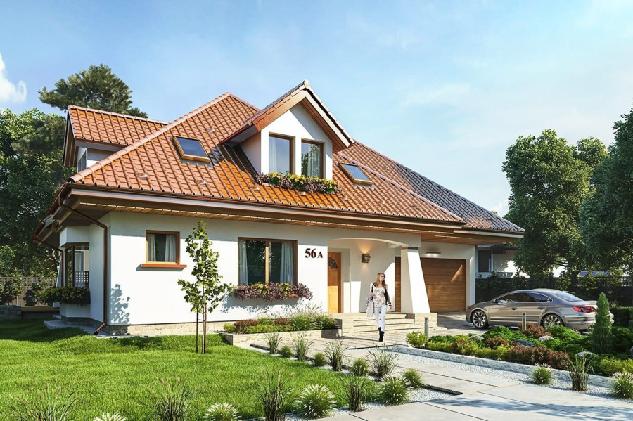 Projekt domu Agnieszka 3 jest nową wersją projektu - Agnieszka. Projekt domu parterowego z poddaszem użytkowym, dla 4- 6-osobowej rodziny. Budynek złożony jest z głównej bryły przekrytej czterospadowym dachem, oraz dobudowanej części garażowej. Architektura domu to połączenie nowoczesnych materiałów, detali i kolorystyki, z tradycyjną formą domu z poddaszem. Agnieszka 3 to okazały, reprezentacyjny dom, o komfortowym wnętrzu. Front domu ozdabia wejściowy podcień z przyporą, oraz lukarna poddasza. Od strony ogrodowej również znajduje się obszerny podcień zadaszający częściowo taras, oraz duże okna (z wykuszem jadalni) i lukarny z balkonikami na poddaszu. Wnętrze: na parterze mamy przede wszystkim wielką część dzienną, z połączonych pomieszczeń salonu jadalni, holu i kuchni. Z przedsionka z wygodną szatnią przechodzimy wprost do holu z szerokimi pięknymi schodami na poddasze. Od frontu umiejscowiona jest kuchnia z wyspą i spiżarnią. Na parterze mamy też dodatkowy pokój i łazienkę, oraz praktyczny schowek gospodarczy. Z szatni przechodzimy również do podwójnego garażu i kotłowni. Na poddaszu mamy trzy sypialnie i dwie łazienki. Sypialnie dzieci z szafami, a sypialnia rodziców z własną garderobą i łazienką, oraz balkonem z widokiem na ogród. Nad częścią garażową z podestu schodów wschodzimy na strych, który może pełnić rolę części gospodarczej (na przykład pralnia –suszarnia i magazyn), ale można go też dowolnie zagospodarować wedle potrzeb Inwestorów. Agnieszka 3 jest zgrabnym budynkiem o zwartej bryle, prostym i niedrogim w budowie – biorąc pod uwagę uzyskaną powierzchnię. Dom jest bardzo dobrze ocieplony, zawiera rozwiązania energooszczędne. W łatwy sposób można go dostosować do standardu NF40. Agnieszka 3 to doskonała propozycja dla osób planujących reprezentacyjnego budowę domu z poddaszem użytkowym, dużego, ale za sensowne pieniądze. Zapraszamy do zapoznania się z pełną ofertą pracowni architektury MG Projekt: projekt domu Agnieszka, projekt domu Agnieszka 2, projekt domu Agnieszka 3 B