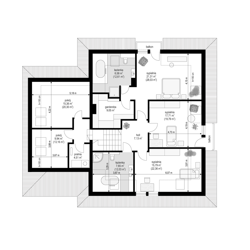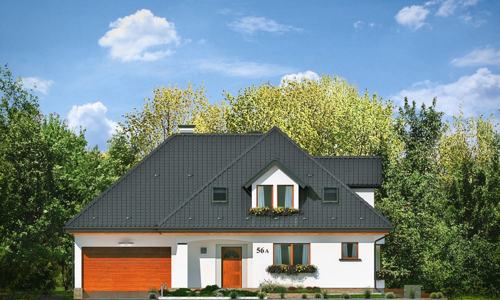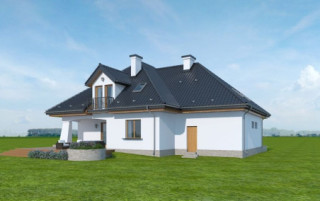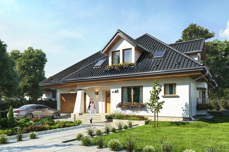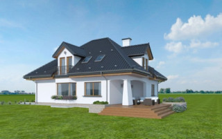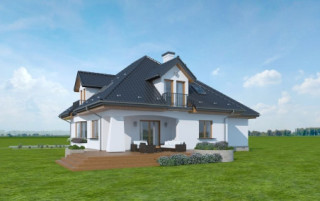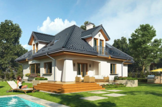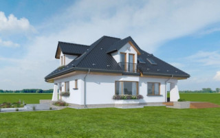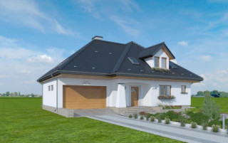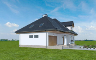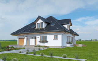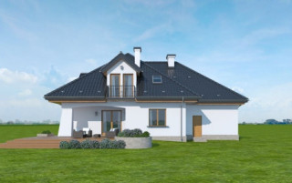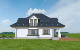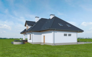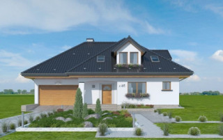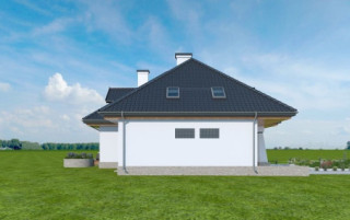 Projekt domu Agnieszka 3 B jest nową wersją projektu - Agnieszka. Projekt domu parterowego z poddaszem użytkowym, dla 4- 8-osobowej rodziny. Budynek składa się z głównej bryły przykrytej czterospadowym dachem ozdobionym trzema lukarnami, oraz dobudowanego do niej garażu z kotłownią. Architektura domu łączy w sobie nowoczesne materiały, kolorystykę i rozwiązania, z tradycyjną sylwetką domu z poddaszem. Agnieszka 3 B jest reprezentacyjnym i okazałym domem. Wejście ozdobione zostało narożnym podcieniem z delikatnym łukiem. Od strony ogrodu mamy również piękny podcień zadaszający częściowo taras, oraz duże przeszklenia, wykusz jadalni i lukarny poddasza. Wnętrze domu: na parter wchodzimy przez przedsionek z wygodną szatnią, wprost do przestrzeni dziennej połączonego holu, salonu i jadalni. To bardzo ładna, niemal sześćdziesięciometrowa otwarta powierzchnia. Od frontu umieszczona została kuchnia z wyspą i spiżarnią. Z holu widoczne są reprezentacyjne schody, oraz dodatkowy pokój (gabinet, lub sypialnie) z własną łazienką. Z szatni przechodzimy do dużego garażu i kotłowni. Na poddaszu mamy trzy piękne, obszerne sypialnie i dwie łazienki. Sypialnie dzieci mają szafy wnękowe. Sypialnie rodziców to osobny apartament, z własną łazienką, piękną garderobą i balkonem z widokiem wprost na ogród. Nad częścią garażową domu mamy dodatkowe dwa pokoje, oraz pralnię. Ilość pokoi jak na dwustumetrowy dom jest imponująca - zmieści się w nim nawet bardzo liczna rodzina. Projekt ma zwartą, dość prostą bryłę. Jest bardzo dobrze ocieplony, ma w sobie energooszczędne rozwiązania. Bardzo łatwo jest dostosować projekt do standardu NF40. Koszty budowy Agnieszki 3 B, biorąc pod uwagę wielkość domu są niskie. Dom będzie dobrą propozycją dla osób planujących budowę dużego domu z przestronnym wnętrzem za korzystną cenę. Zapraszamy do zapoznania się z pełną ofertą pracowni MGProjekt: projekt domu Agnieszka, projekt domu Agnieszka 2, projekt domu Agnieszka 3.
