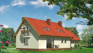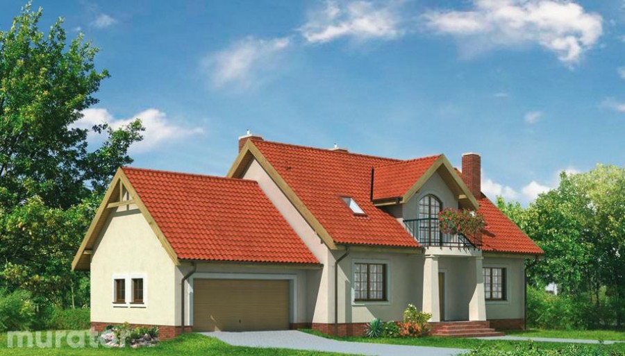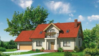 <b>Prosta bryła</b> z dwuspadowych dachem wygląda atrakcyjnie i sympatycznie. Reprezentacyjne wejście podkreślają dwa filary, a powyżej znajduje się balkon z efektownym zadaszeniem. Do jednej z bocznych ścian dostawiono dwuosobowy garaż. W prawym skrzydle domu zaplanowano część wspólną dla wszystkich domowników. Duża, otwarta przestrzeń robi wrażenie i pozwala na efektowne urządzenie wnętrza. <b>Salon</b>, jadalnia i hol tworzą jedną całość. Jeżeli wolimy zamkniętą kuchnię można ją w łatwy sposób wydzielić, montując np. drzwi przesuwne. Pokój na lewo od wejścia to wygodny gabinet, z oknem wychodzącym od frontu. Z tyłu domu, blisko garażu umiejscowiono spore pomieszczenie gospodarcze. Poddasze służy do wypoczynku, nauki, zabawy i snu. Oprócz trzech sypialni, miły kąc