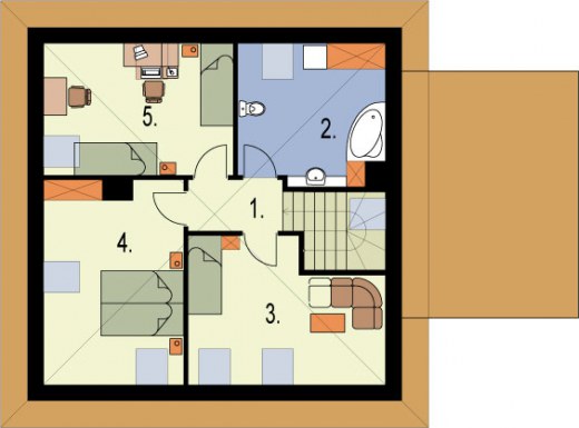 Ganek znajdujący się w niedużej wnęce zachęca do wejścia do środka. Prowadzi on do wiatrołapu, po wyjściu z którego po prawej znajduje się komunikacja, naprzeciw niej natomiast usytuowany jest przestronny, ale i przytulny salon. Można z niego wyjść na sporych rozmiarów taras, który stwarza wiele okazji do rodzinnych spotkań oraz całorocznego uroczystego świętowania na świeżym powietrzu. Kuchnia znajduje się tuż za salonem i jest połączona z jadalnią. Posiada ona połączenie z kotłownią, a ta znowu, sąsiaduje przez ścianę z łazienką wyposażoną w prysznic, która za ścia