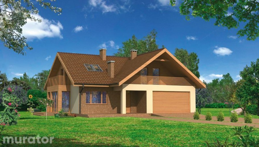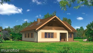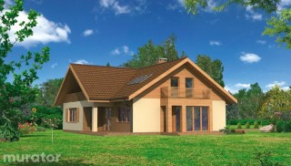 Wygodny, o prostej, uniwersalnej architekturze dom, w sam raz dla 5-6 osobowej rodziny, którego dodatkową zaletą jest, tak poszukiwany przez inwestorów, <b>dwustanowiskowy garaż</b>. Parter dzieli się na dwie funkcjonalne strefy. Pierwsza centralna, skupiona wokół wolnostojącego kominka i w głównej mierze jednoprzestrzenna, obejmuje <b>przestronny salon</b> połączony z zadaszonym tarasem, aneks jadalny w wychodzącym na boczny taras wykuszu i otwartą kuchnię. Druga składa się z dużego pokoju, ustawnej łazienki, wydzielonej klatki schodowej i wc dla gości. Położenie pokoju w zacisznej części domu oraz to, że ma on osobne wyjście do ogrodu predystynuje go na miejsce azylu rodziców lub doras-tającego dziecka. Program parteru uzupełnia pomieszczenie gospodarcze dostępne
