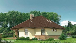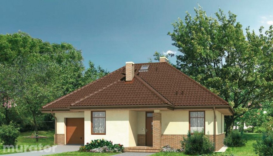 Zgrabny i ustawny dom, który łatwo można dopasować do każdego typu działki, a estetyczne i ładne wykończenie elewacji sprawia, że będzie wyglądał przytulnie i swojsko. Na pochwałę zasługuje czytelny podział wnętrz oraz przemyślane i funkcjonalne zagospodarowanie każdego metra kwadratowego. Ten projekt to kolejna <b>wersja domu</b> „Murator M05”, powiększona o dodatkowy pokój na parterze oraz wygodne garderoby na poddaszu. Jest więc odpowiedni dla większej, nawet pięcioosobowej rodziny. Tuż za wejściem rozciąga się ładny widok na <b>salon</b> połączony z jadalnią i kuchnią. Na lewo, umiejętnie odizolowana od strefy dziennej, znajduje się część gospodarcza, a oddzielny korytarz prowadzi do dwóch sypialni, usytuowanych w głębi domu. Poddasze to enklaw