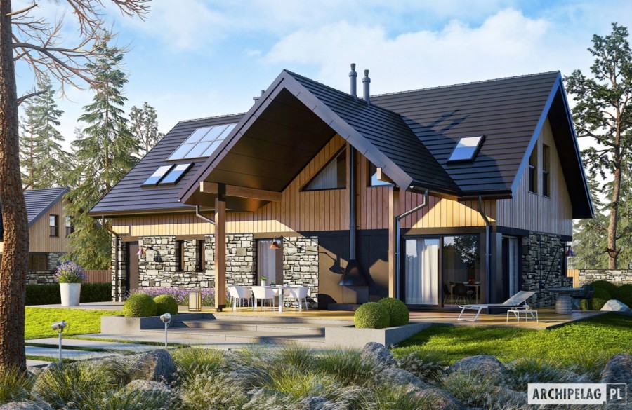Charakterystyka: Dom parterowy z poddaszem użytkowym, niepodpiwniczony, z garażem jednostanowiskowymPrzeznaczenie: Dom dla 3-5-osobowej rodziny Technologia i konstrukcja:Ściany zewnętrzne: murowane, dwuwarstwowe, beton komórkowy firmy Solbet 24 cm, ocieplenie styropian Termo Organika 20 cmŚciany wewnętrzne: nośne i działowe murowane, beton komórkowy firmy Solbet 24 cm i 12 cmStrop: międzypiętrowy gęstożebrowy TerivaDach: konstrukcja drewniana, ocieplenie wełna mineralna ISOVER 30 cm, dachówka ceramiczna płaska Bergamo firmy RöbenInne: schody wewnętrzne drewniane Rozwiązania instalacyjne:Ogrzewanie: kocioł gazowy kondensacyjny, rozprowadzenie ciepła: grzejnikiWentylacja: grawitacyjnaOZE: kolektory słoneczne Wykończenie:Elewacje: płyty ROCKPANEL, okładzina drewniana i kamiennaStolarka: aluminiowa firmy Reynaers Aluminium lub drewniana, drzwi wejściowe i brama garażowa firmy HörmannOkna połaciowe: rozwiązania technologiczne i wyłaz dachowy firmy FAKROOtoczenie: kostka betonowa i płyty tarasowe firmy Libet, system tarasowy ProDeck - deska kompozytowa Terra w kolorze orzech Wersje w serii Nikolas - zapytaj o dostępność: - Nikolas – wersja podstawowa, standardowe instalacje: ogrzewanie gazowe, wentylacja grawitacyjna, system solarny - Nikolas II ENERGO PLUS - podobny układ funkcjonalny, inne wymiary budynku, energooszczędne instalacje: pompa ciepła i ogrzewanie podłogowe, wentylacja mechaniczna z rekuperacją, system solarny - Nikolas II ENERGO PLUS reco - energooszczędne instalacje firmy Vaillant: pompa ciepła, wentylacja mechaniczna z rekuperacją oraz system fotowoltaiczny, ogrzewanie podłogowe firmy Purmo - wszystkie wersje o podobnym układzie funkcji oraz z inną propozycją wykończenia elewacji - wszystkie wersje z trzema wariantami garaży: bez garażu, z garażem jedno- i dwustanowiskowym - odbicie lustrzane do każdej wersjiWszystkie wersje domów możliwe w dwóch standardach/wariantach instalacyjnych: - ENERGO: kocioł gazowy kondensacyjny, grzejniki, wentylacja grawitacyjna, OZE: kolektory słoneczne - ENERGO PLUS: pompa ciepła, ogrzewanie podłogowe, wentylacja mechaniczna, OZE: kolektory słoneczne lub panele fotowoltaiczneIstnieje techniczna możliwość: - podpiwniczenia budynku - wykonania budynku w technologii szkieletowej
