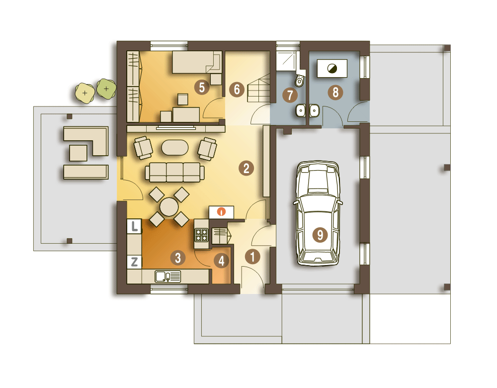 Nowinka jest projektem domu, który spełnia wymogi współczesnego budownictwa jednorodzinnego. Jest to dom ekonomiczny w użytkowaniu ze względu na zwartą, prostą bryłę, nieskomplikowany dach oraz skumulowane łazienki i kotłownia w jednym pionie w celu obniżenia kosztów eksploatacji i budowy. Projekt tego kompaktowego domu przewiduje na parterze salon z otwartą kuchnią ze spiżarnią, pokój gościnny, wiatrołap, łazienkę. W bryle budynku został zawarty również garaż oraz duża kotłownia przewidziana na paliwo stałe. Poddasze przeznaczono na trzy sypialnie, łazienkę i garderobę. Z boku budynku zaprojektowano wiatę.Wizualizacje salonu, łazienki oraz sypialni mają za zadanie pomóc w wyobrażeniu wnętrza. Umeblowanie i wyposażenie domu zostało pokazane jako przykładowe i ma służyć dowolnej inspiracji. Wierzymy, że wnętrza prawdziwego domu, które powstaną na bazie projektu Nowinka, będą stanowiły dla państwa nieustające źródło radości.