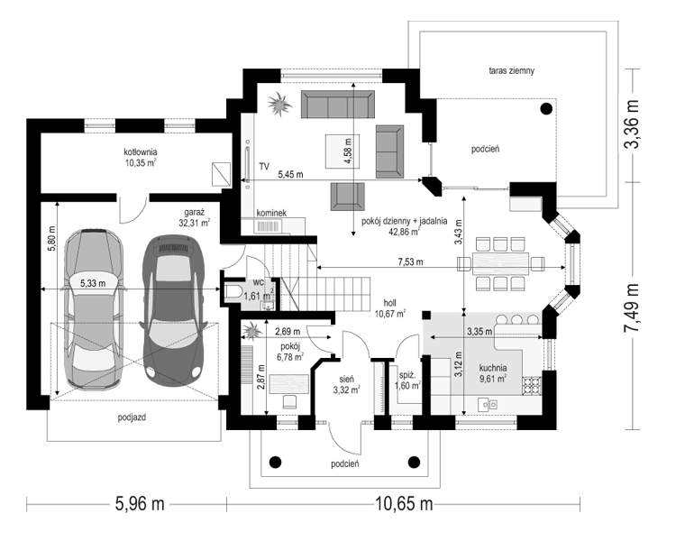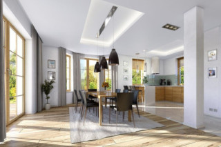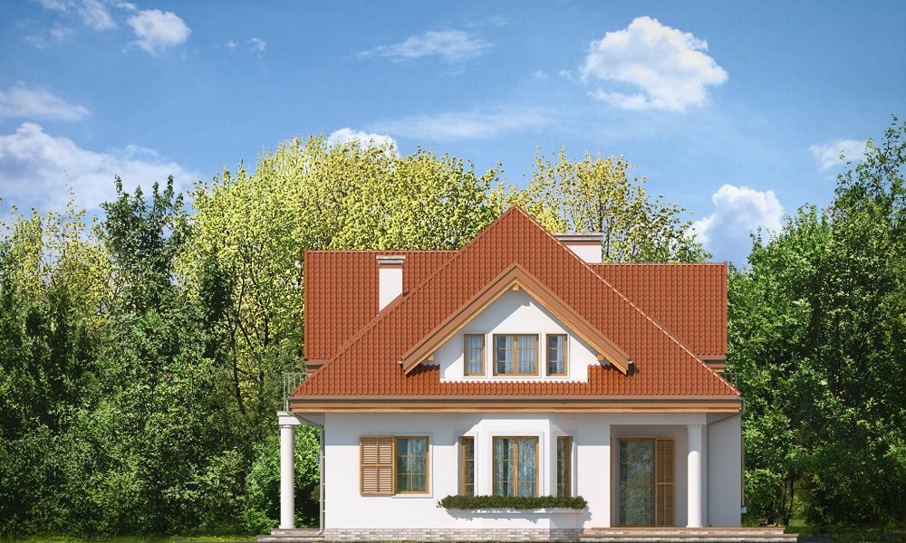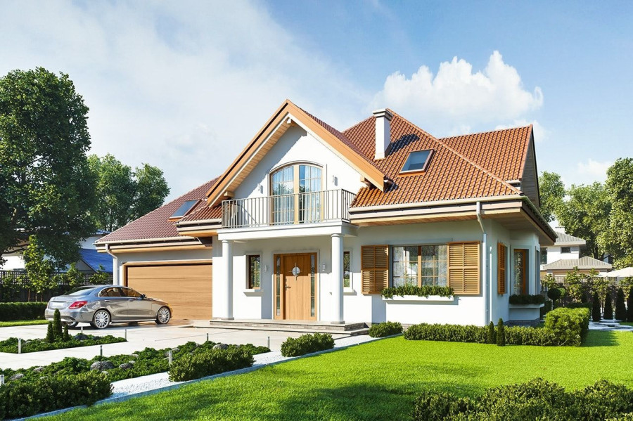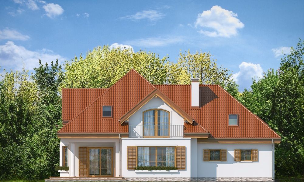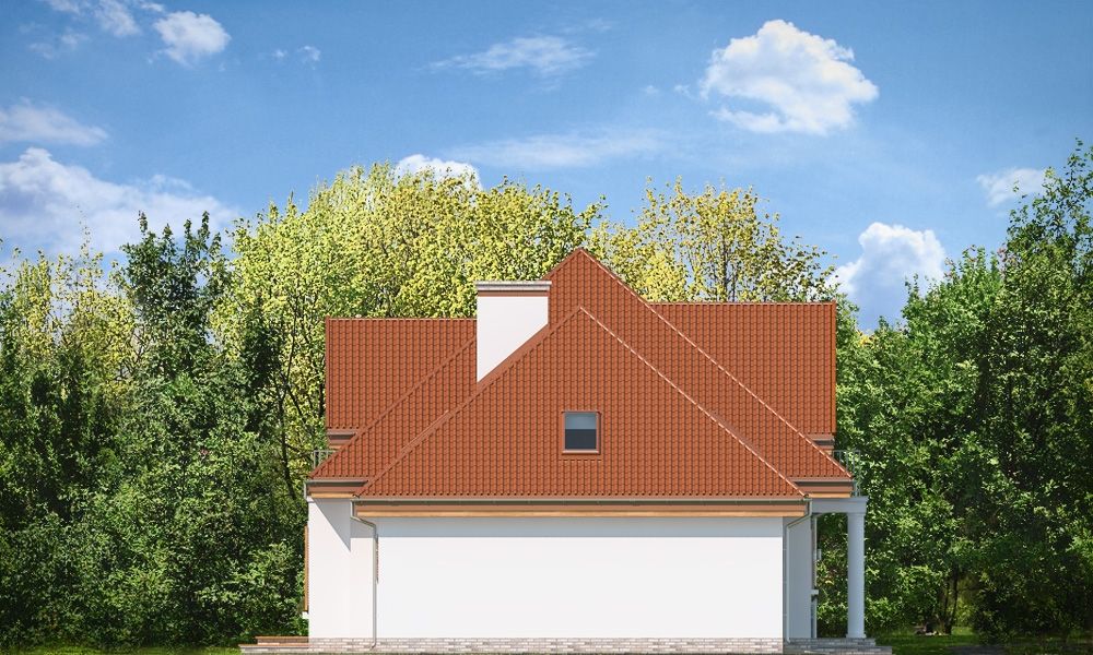 Projekt domu Willa Julia MGProjekt jest jednym z dwóch najnowszych projektów inspirowanych cieszącym się popularnością projektem Julka. Domy są bardzo podobne do swojego pierwowzoru, pozmieniano w nich jednak i usprawniono niektóre rzeczy, wprowadzając rozwiązania Inwestorów budujących wcześniej Julkę. Projekt domu Willa Julia architektura i wnętrze Willa Julia zatem to dom parterowy z poddaszem użytkowym, przykryty czterospadowym dachem z dobudowaną częścią garażową, z dużym dwustanowiskowym garażem i poddaszem- strychem. Architektura budynku to połączenie tradycyjnej formy polskiego dachowca, z wielospadowym dachem urozmaiconym szerokimi lukarnami, z nowoczesnymi detalami i materiałami zastosowanymi w budynku. Front w projekcie domku Willa Julia zaakcentowano podcieniem wejściowym z balkonem na kolumnach. Stąd, szerokimi drzwiami z bocznymi naświetlami przechodzimy do wnętrza projektu Willa Julia. Od strony ogrodu w projekcie domu Willa Julia zaplanowano wygodny podcień – zadaszenie tarasu i piękne niskie okno z salonu na ogród. Duże przeszklenia z ładnymi podziałami stanowią ozdobę projektu Willa Julia. Dobrze dobrane proporcje ścian i dachu sprawiają, że projekt Willa Julia nie traci ludzkiej skali. We wnętrzu projektu domku Willa Julia na parterze przewidzieliśmy dużą część dzienną, z salonem, jadalnią, holem i kuchnią. Przy kuchni domostwa zaprojektowano spiżarkę. Przy wejściu do domu Willa Julia mamy niewielki pokój - na przykład domowe biuro (mogące służyć okazyjnie jako sypialnia gościnna). Pod schodami umieszczono wc, oraz przejście drzwiami do części garażowo –gospodarczej. Za dużym garażem w tym domu jednorodzinnym znajduje się kotłownia. Na poddaszu budynku zaprojektowaliśmy trzy wygodne sypialnie: sypialnie dzieci z szafami wbudowanymi, oraz sypialnię rodziców z garderobą. Dodatkowo miejsce znalazła spora łazienka. Nad garażem w projekcie domku Willa Julia mieści się strych do dowolnego zagospodarowania. Gotowy projekt domu jednorodzinnego Willa Julia jest budynkiem energooszczędnym, bardzo dobrze ocieplonym, o zwartej bryle, dzięki czemu koszt budowy domu jest niski. Gotowy projekt domku Willa Julia będzie dość łatwy w budowie i niedrogi w późniejszym użytkowaniu. Projekt Willa Julia dostępny jest także w odbiciu lustrzanym, oraz jako wersja projektu domu Willa Julia 2,