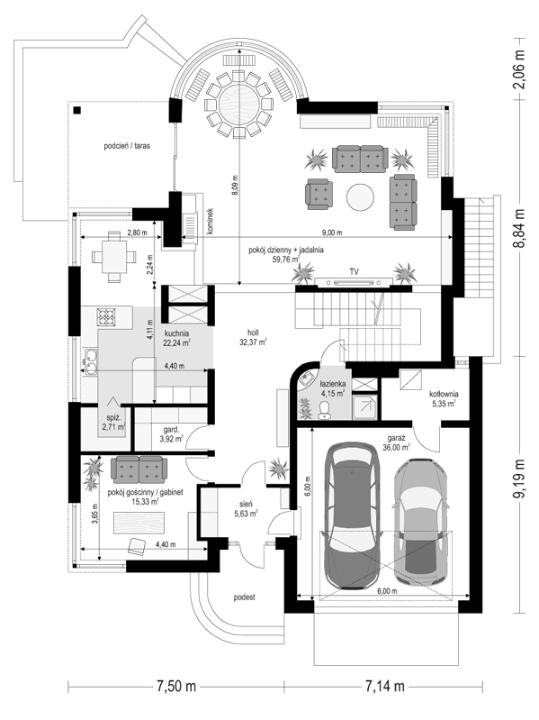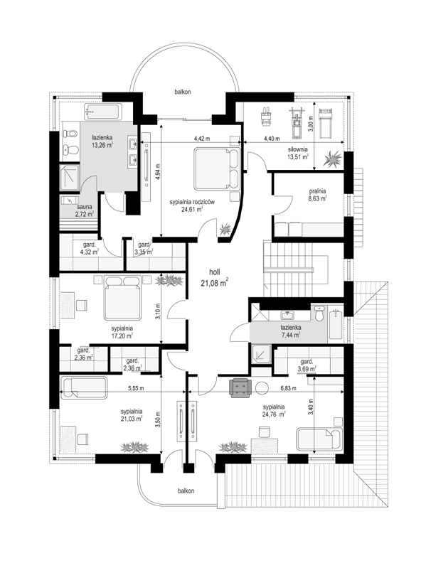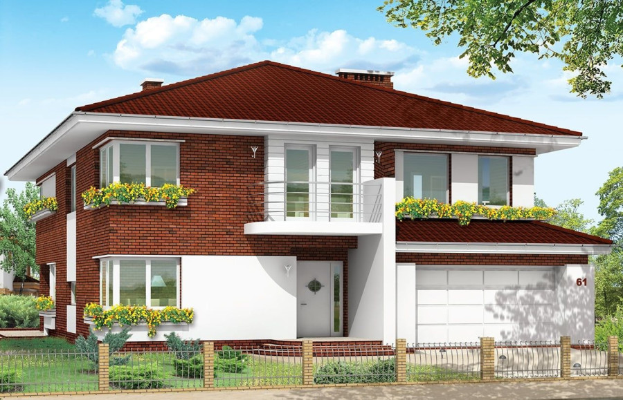 Projekt domu Gabriela 3 to prestiżowy dom o jednopiętrowej bryle przekryty czterospadowym dachem, przeznaczony dla 4- 6-osobowej rodziny. Architektura domu Gabriela 3 nawiązuje do stylu modernistycznego, we współczesnym ujęciu. Elementy, takie jak narożne okna, balkony z zaokrąglonymi balustradami, łukowy wykusz jadalni, podział elewacji na poziome pasy tworzą ciekawą stylistycznie architekturę zewnętrzną budynku. Dla projektu domu Gabriela 3 przewidziano kilka różnych wariantów aranżacji elewacji. Wnętrze willi: na parterze przestrzeń dzienna składająca się z salonu, jadalni z pięknym łukowym wykuszem, przestronnego holu z wygodnymi schodami na piętro, obszernej kuchni z aneksem na szybkie posiłki. Z pokoju dziennego wychodzimy do podcienia i na taras. Na parterze zaprojektowano również gabinet, garaż i kotłownię. Na piętrze znajduje się apartament rodziców z łazienką, garderobą i tarasem na ogród, trzy sypialnie dzieci, z łazienką, oraz pralnią i pokój sportowy. W domku Gabriela 3 zaprojektowano również częściowe podpiwniczenie - piwnica dostępna z zewnątrz domu, schodkami z ogrodu. Z piwnicy można zrezygnować jeśli warunki gruntowe nie pozwalają na jej budowę. Projekt domu Gabriela 3 dostępny jest również w innych wersjach: odbicia lustrzanego, projekt domu Gabriela oraz projekt domu Gabriela 2. Zapraszamy!