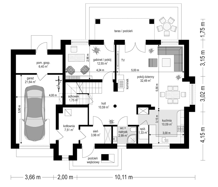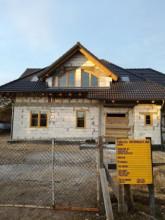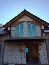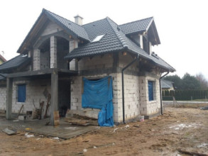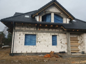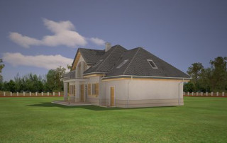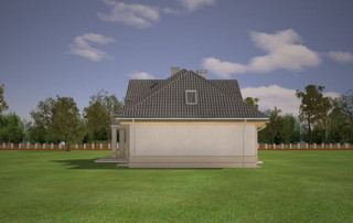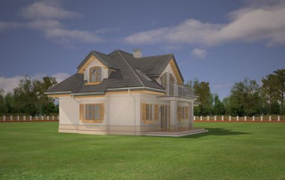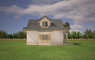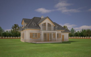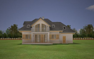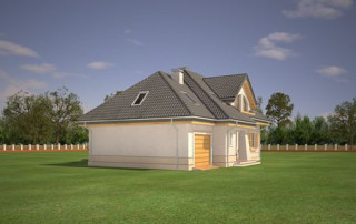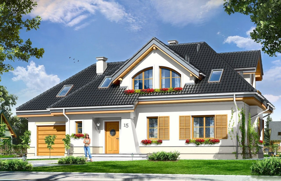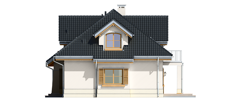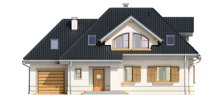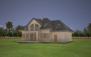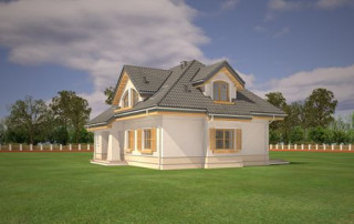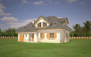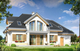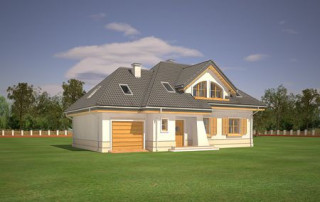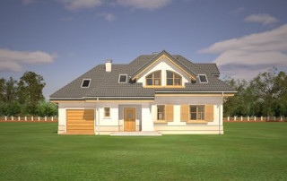 Projekt domu Gabryś to budynek dla 4- 6-sobowej rodziny. Parterowy, z poddaszem użytkowym, przykryty został czterospadowym dachem, z trzema ozdobnymi lukarnami - po jednej na każdej elewacji. Do części mieszkalnej dobudowany jest garaż ze strychem na poddaszu. Projekt domu Gabryś to bardzo dostojny i elegancki dom, podkreślający status i dobry gust właściciela. Architektura domu Gabryś to połączenie klasycznego stylu, odwołującego się do polskiego dworku, z jego nowoczesną interpretacją. Reprezentacyjne wejście podkreślone zadaszonym podcieniem i kolumną z przyporą, oraz rozłożystymi schodkami, w połączeniu z dużą lukarną na poddaszu z dwoma łukowymi oknami tworzą pełną uroku elewację frontową. Podobnie strona ogrodowa – z zadaszonym tarasem, balkonem na dwóch kolumnach i szeroką lukarną będzie bardzo atrakcyjnym tłem dla ogrodu. Wnętrze domu jest bardzo przestronne i funkcjonalne. Wygodny przedsionek i duży holl, połączony przestrzennie z salonem i z ładnie wyeksponowanymi schodami na poddasze tworzą atrakcyjne wejście do domu. Wygodna kuchnia połączona jest częściowo z salonem. W pokoju dziennym, prócz miejsca na meble wypoczynkowe, kominek i ścianę TV, znalazł się też aneks jadalny, z ładnym wykuszem z oknem. Na parterze mieszczą się też: dodatkowy pokój (gabinet lub sypialnia), duża kotłownia, oraz garaż z pomieszczeniem gospodarczym na sprzęty ogrodowe. Na poddaszu zaprojektowano od strony ogrodowej wydzielony apartament rodziców z własną łazienką, garderobą i tarasem z widokiem na ogród, oraz dodatkowo dwie ładne sypialnie dzieci z łazienką. Nad garażem znajduje się strych, który bardzo łatwo można zaadaptować na pomieszczenie użytkowe. Pracownia posiada również wersję odbicia lustrzanego projektu domu Gabryś.