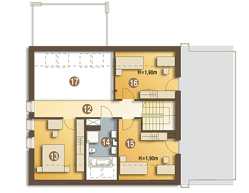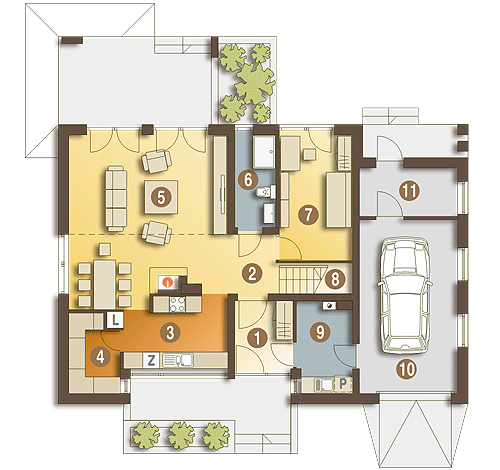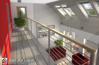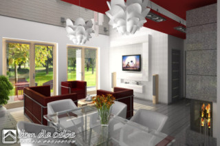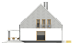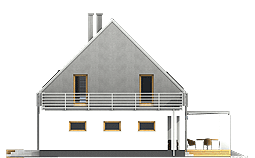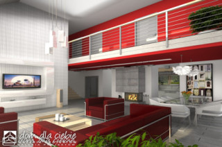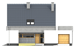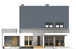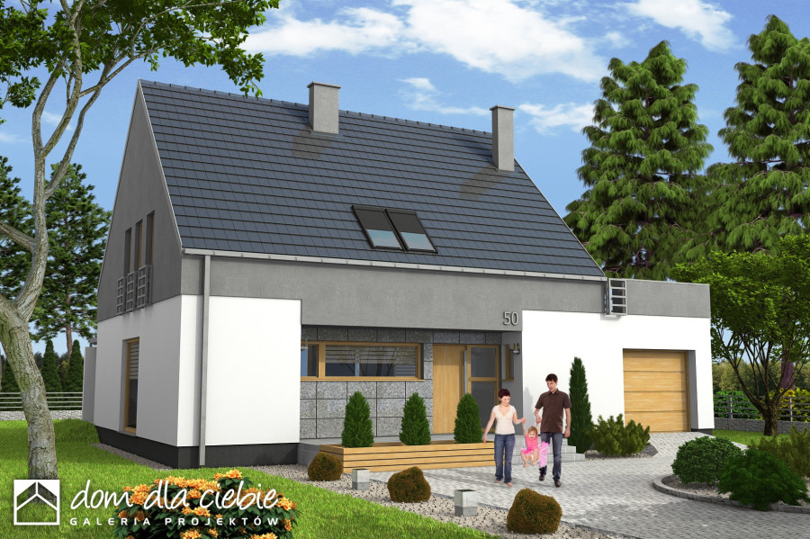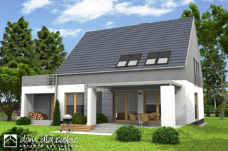 Nowoczesny dom jednorodzinny z antresolą, o prostej, energooszczędnej bryle i nieskomplikowanych rozwiązaniach konstrukcyjnych. Dom przeznaczony jest dla 4-5 osobowej rodziny. Oprócz podstawowego programu funkcjonalnego zapewniono dużą spiżarnię obok kuchni oraz dodatkowe pomieszczenie gospodarcze za garażem dostępne z ogrodu. Oba wejścia do budynku- główne i do pomieszczenia gosp. za garażem- chronione są przed opadami praktycznymi podcieniami, z których tylny można wykorzystać do składowania drewna kominkowego. Dom posiada atrakcyjny salon- wysoki na dwie kondygnacje- dodatkowo doświetlony oknami połaciowymi sterowanym zdalnie. Z tyłu domu zaprojektowano nowoczesną pergolę na słupach, którą można wyposażyć w poziomą, tekstylną roletę. Poddasze, z atrakcyjnym holem- otwartym na pustkę nad salonem- składa się z 3 wygodnych sypialni oraz dużej łazienki. Obszerny taras nad częścią garażową dostępny jest z dwóch sypialni.fundamenty: BETONOWE ściany zewnętrzne: POROTHERM+STYROPIAN TERMO ORGANIKA rodzaj stropu: TERIVA I elewacje: TYNK STRUKTURALNY pokrycie dachu: DACHÓWKA CEM. lub CER.