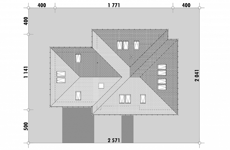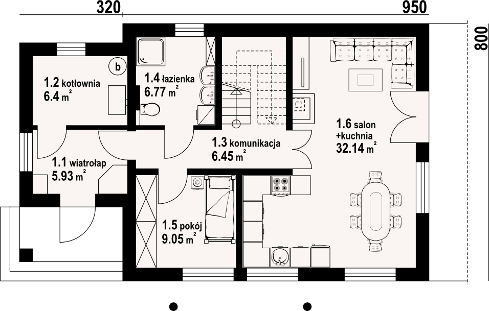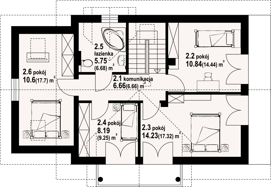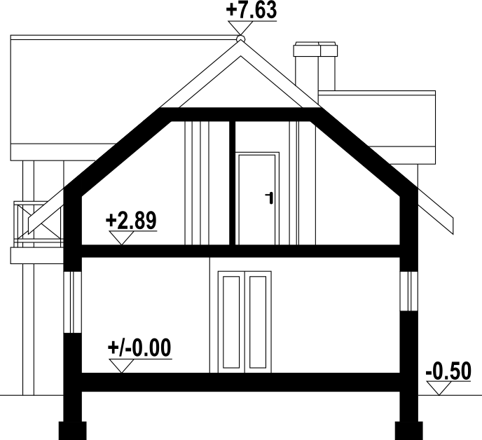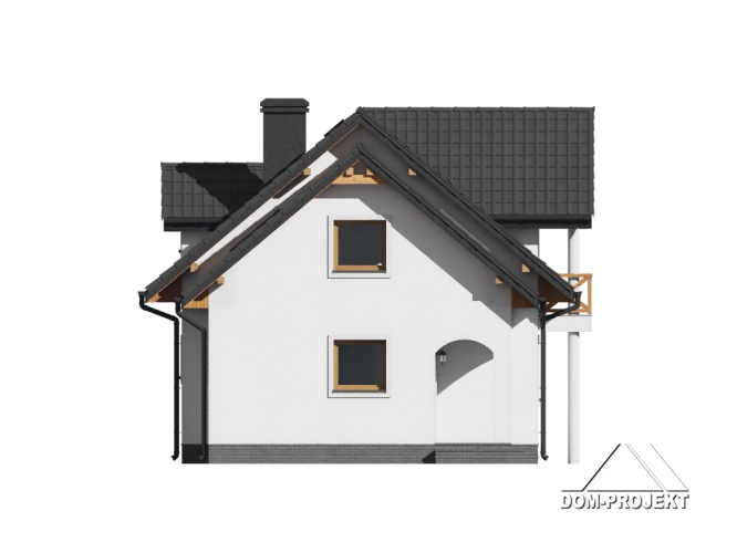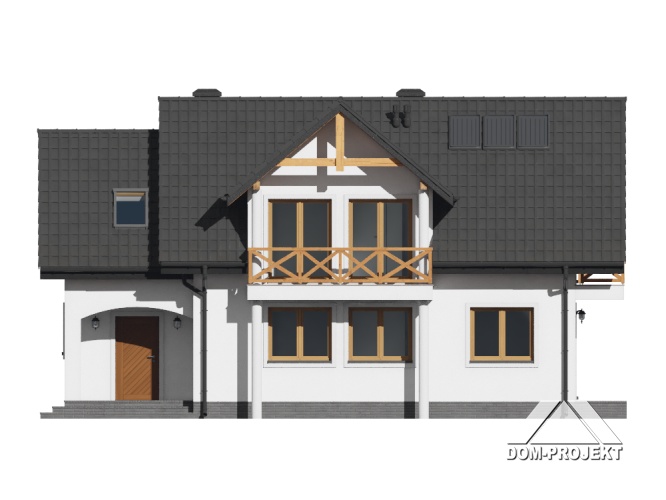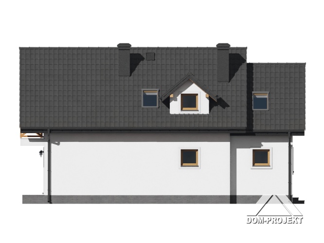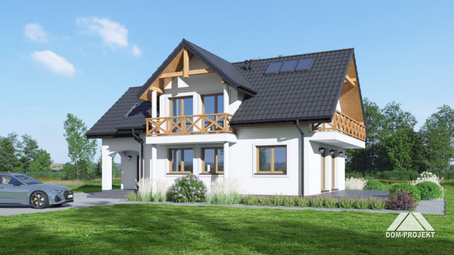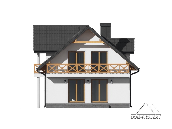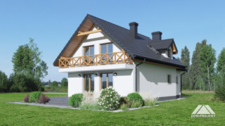 Dom o prostej bryle i funkcjonalnym wnętrzu. Sześć pokoi, dwie łazienki, kotłownia, aneks kuchenny,wiatrołap. Duży salon z kominkiem i wyjściem na taras. Trzy pokoje poddasza mają balkon. Dom łatwy i tani w budowie i eksploatacji. Liczne wersje projektu.