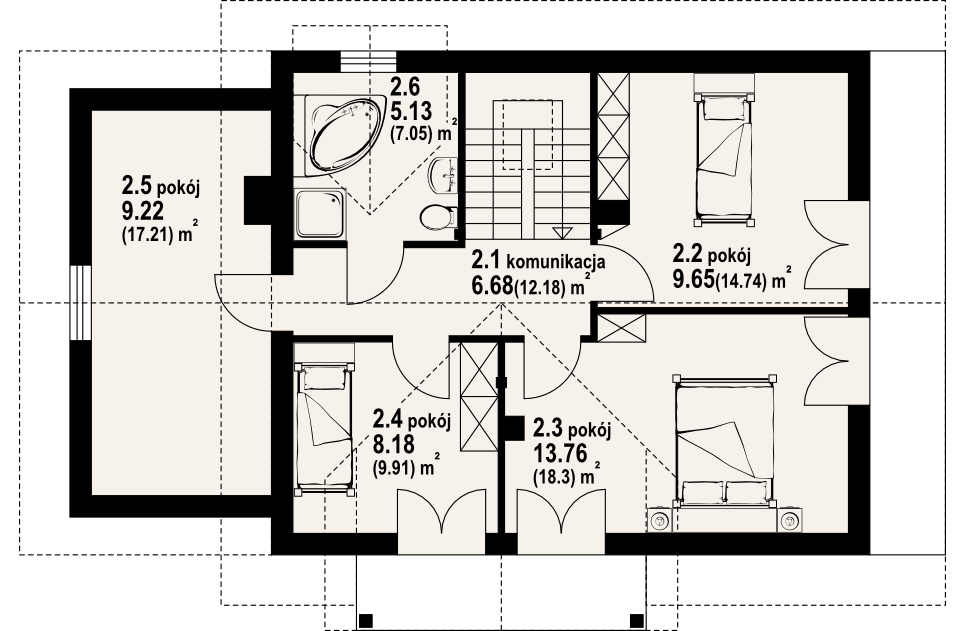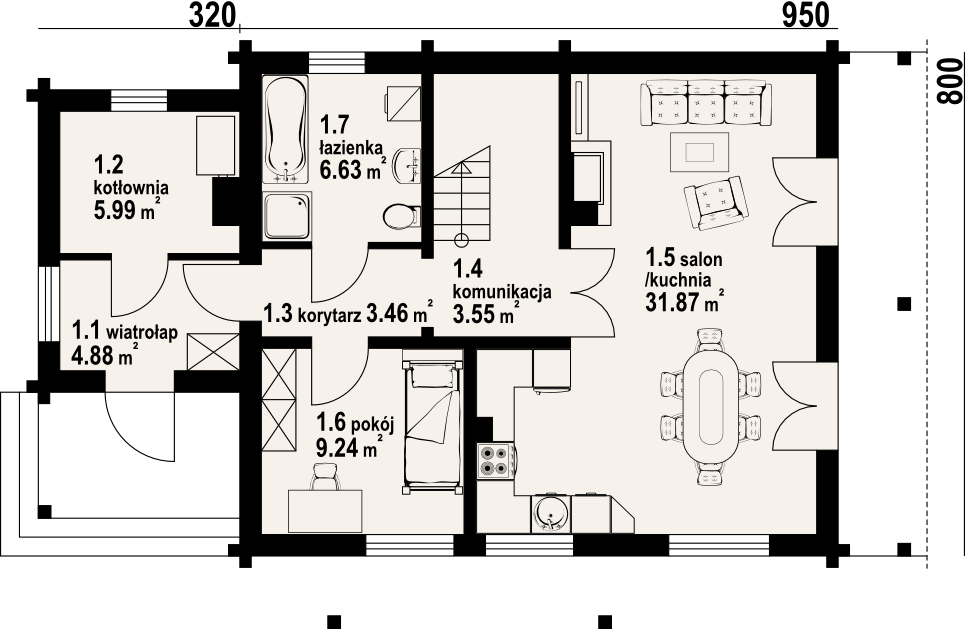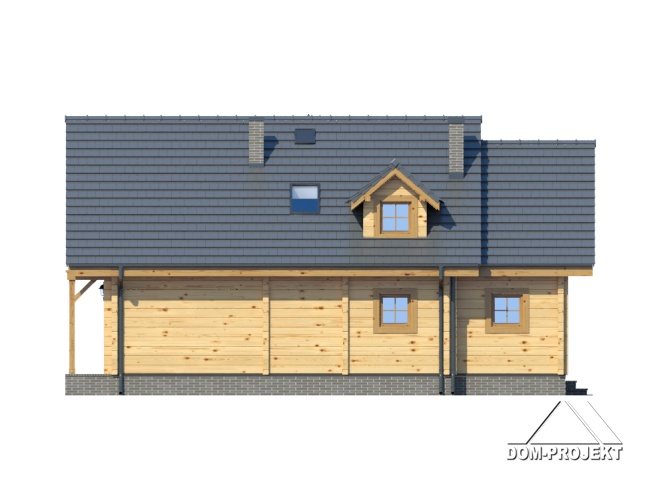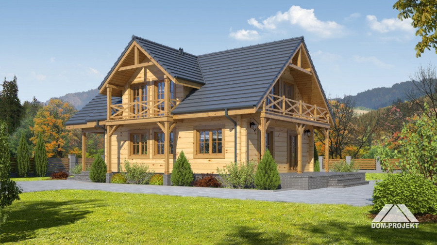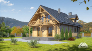 Dom z bali drewnianych. 6 pokoi, 2 łazienki, aneks kuchenny, kotłownia, wiatrołap. Duży salon z kominkiem i wyjściem na taras. 3 pokoje poddasza mają balkon. Dom o prostej bryle i funkcjonalnym wnętrzu, łatwy w budowie i tani w eksploatacji. Liczne wersje projektu.