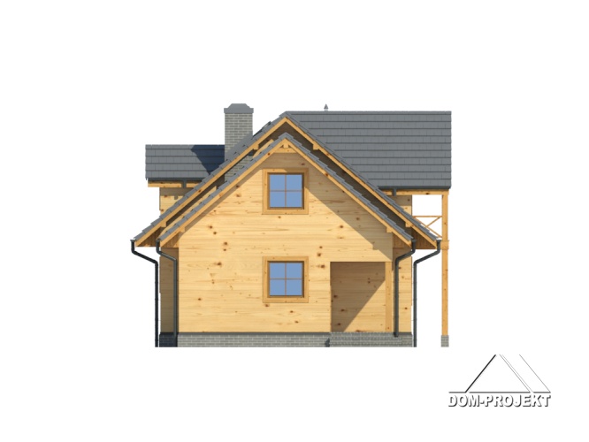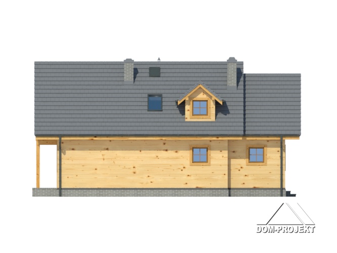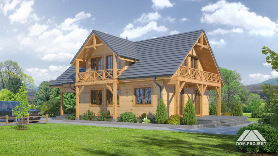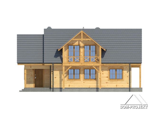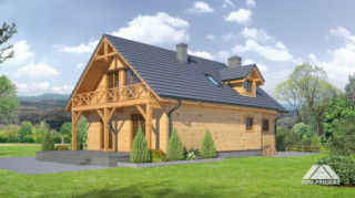 Dom w konstrukcji szkieletu drewnianego. Duży salon z aneksem kuchennym, wyjściem na taras i kominkiem. Pokój, łazienka, komunikacja, kotłownia i wiatrołap. Na poddaszu cztery pokoje, łazienka i komunikacja. Dwa balkony. Zwarta bryła budynku sprzyja szybkiej budowie i niskim kosztom eksploatacji.