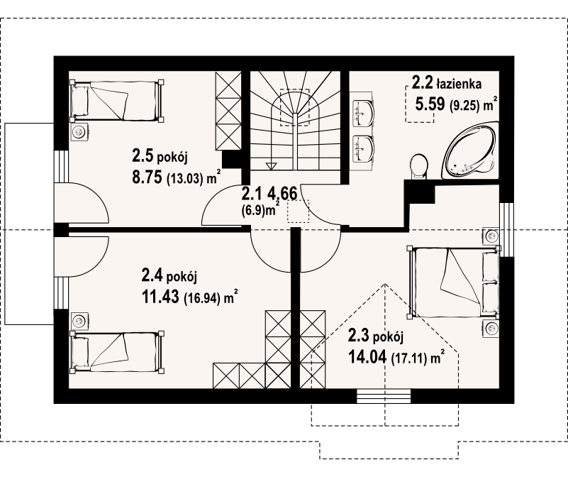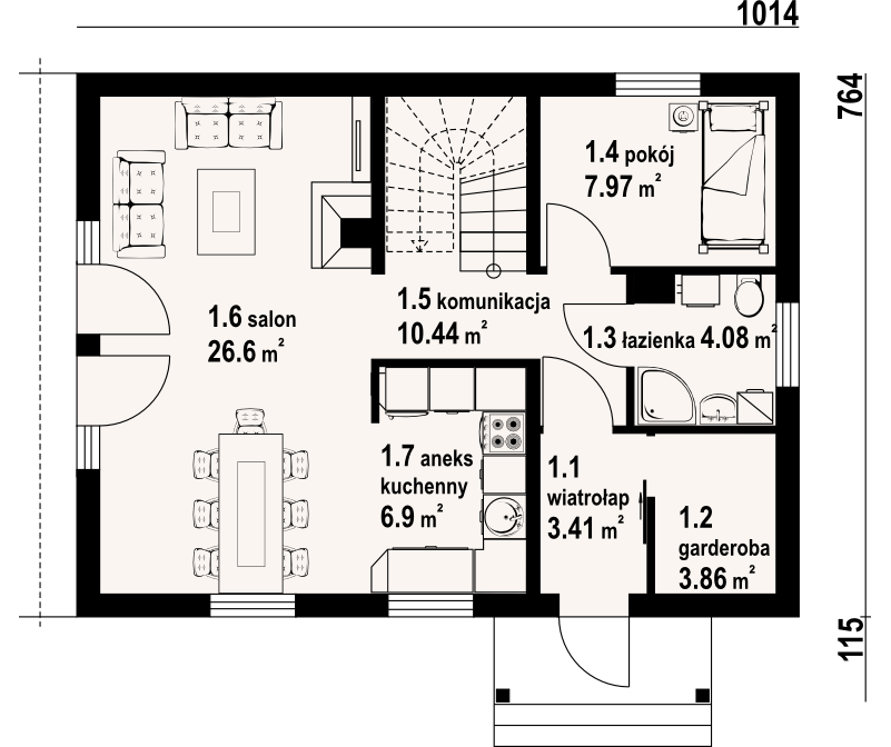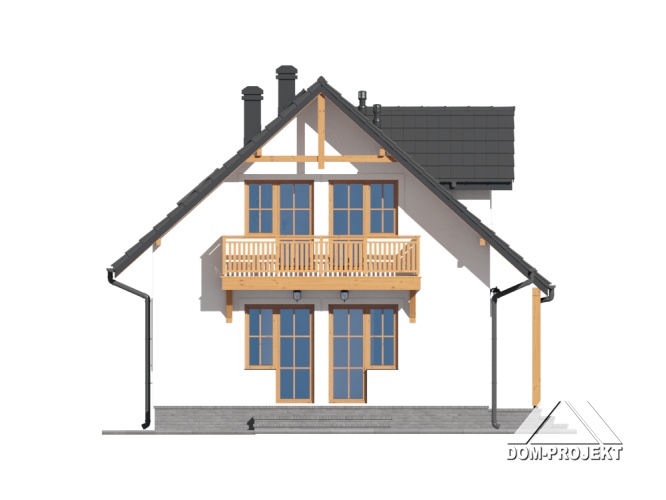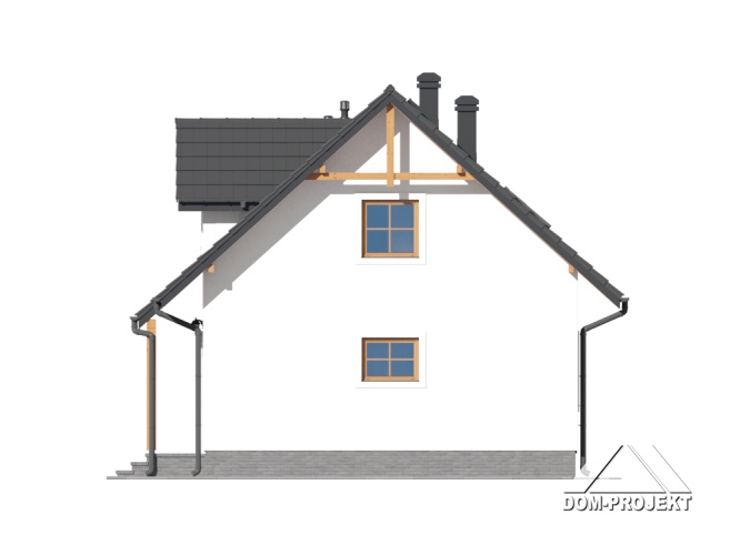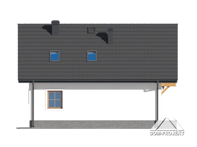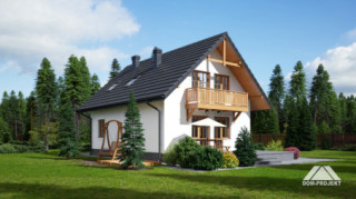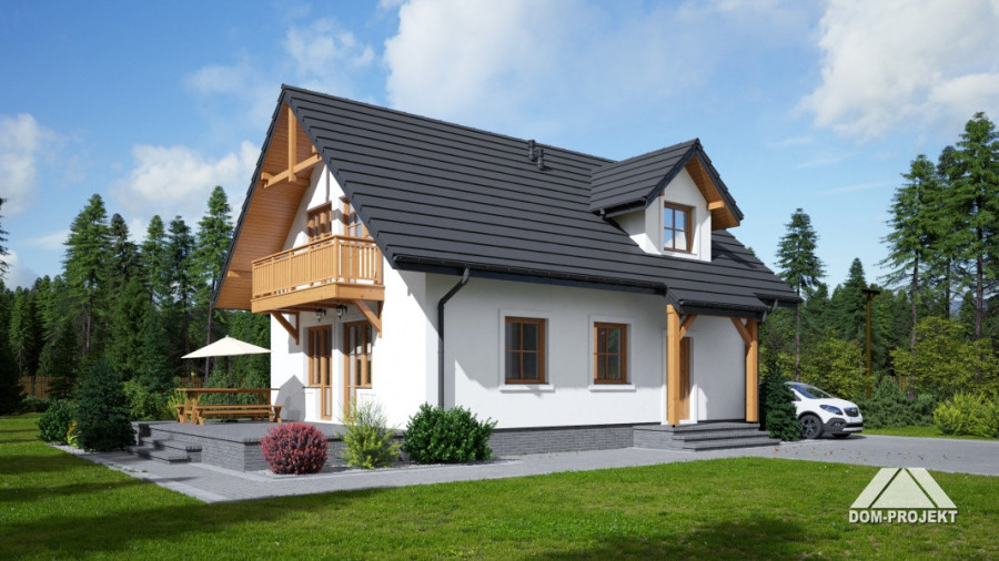 Mały a zarazem funkcjonalny dom parterowy z poddaszem mieszkalnym. Na parterze kuchnia połączona z salonem i dodatkowy pokój, ponadto łazienka i garderoba. Kominek w salonie. Na poddaszu trzy sypialnie, w tym dwie z wyjściem na balkon oraz łazienka. Niskie koszty budowy i eksploatacji.