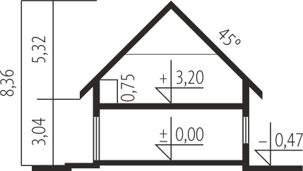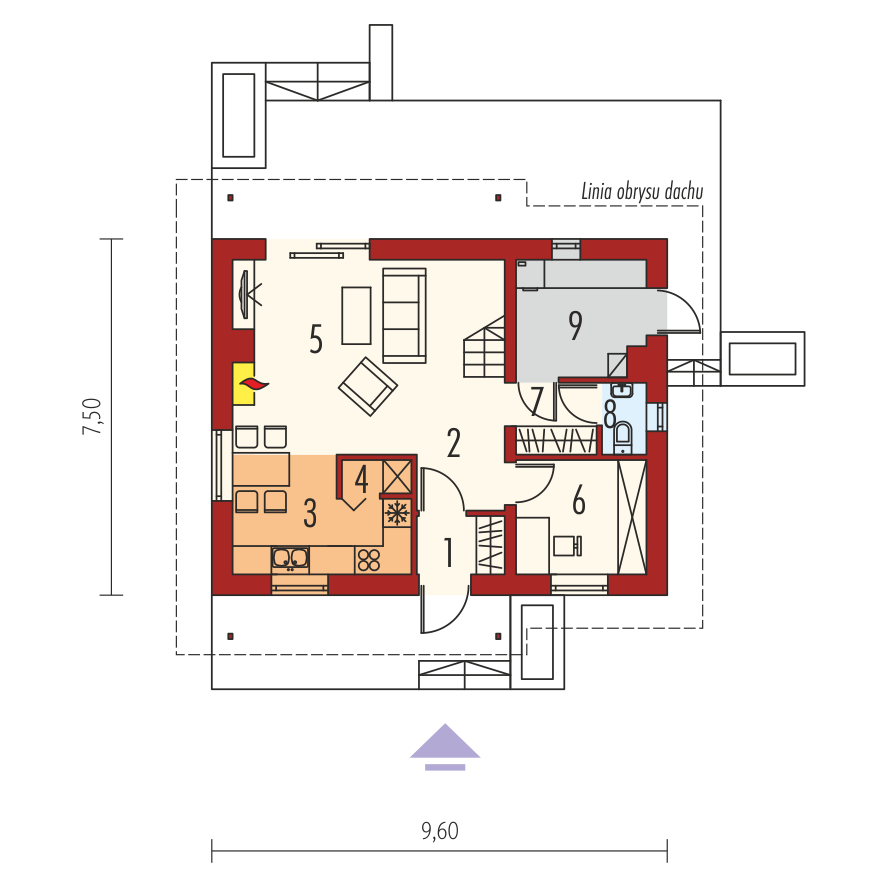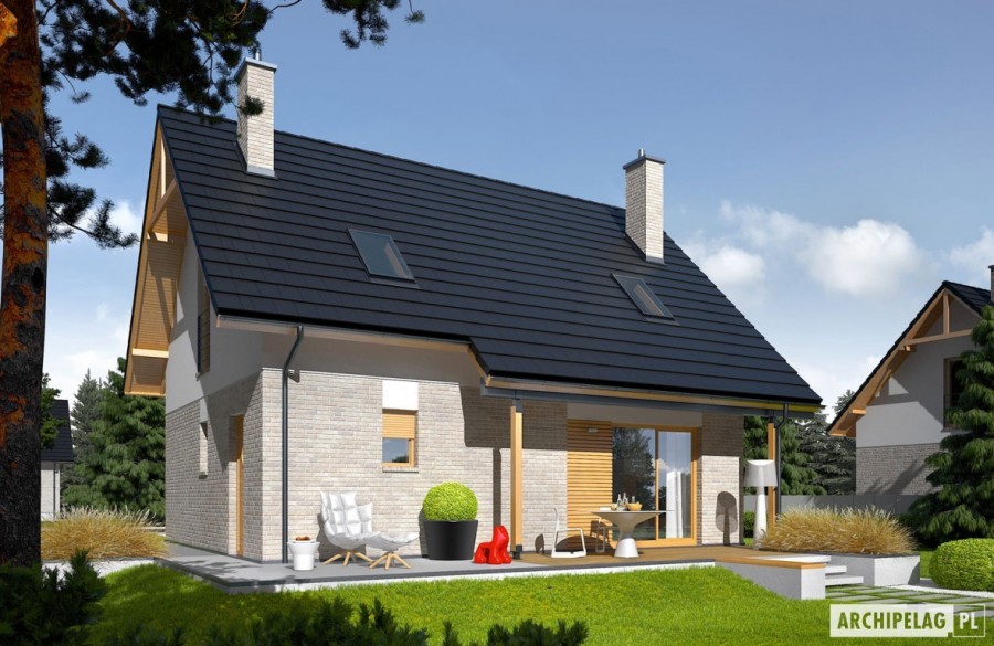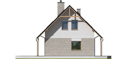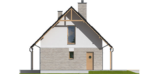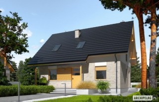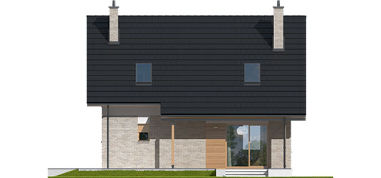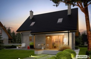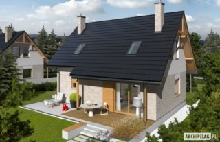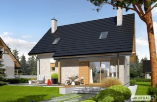 Charakterystyka: Dom parterowy z poddaszem użytkowym, niepodpiwniczonyPrzeznaczenie: Dom dla 3-5-osobowej rodzinyTechnologia i konstrukcja:Fundamenty: ławy, bloczki betonowe 24 cm, ocieplenie styropian 15 cmŚciany zewnętrzne: murowane, dwuwarstwowe, beton komórkowy firmy H+H 24 cm, ocieplenie 20 cmŚciany wewnętrzne: murowane, beton komórkowy firmy H+H, ściany nośne 24 cm, ścianki działowe 11,5 cmPodłoga na gruncie: płyta betonowa, ocieplenie styropian 15 cmStrop: międzypiętrowy gęstożebrowy TerivaDach: konstrukcja drewniana, ocieplenie wełna mineralna 30 cm, dachówka ceramiczna płaska firmy Röben Inne: schody wewnętrzne drewniane Rozwiązania instalacyjne:Ogrzewanie: kocioł gazowy, rozprowadzenie ciepła: grzejnikiWentylacja: grawitacyjna Wykończenie:Elewacje: tynk cienkowarstwowy mineralny w kolorze TO-PA001 z palety firmy Termo Organika, okładzina z płyty HPL z naturalną okleiną drewnianą firmy Prodema i okładzina klinkierowa firmy Röben Stolarka: drewniana, PVC lub aluminiowa, drzwi wejściowe firmy Hörmann, rolety zewnętrzne w systemie CleverBox firmy BeCleverOkna połaciowe: rozwiązania technologiczne firmy FAKRO Otoczenie: system tarasowy ProDeck - deska kompozytowa Terra w kolorze orzechDostępne wersje:- Odbicie lustrzane Istnieje możliwość:- podpiwniczenia budynku- wykonania budynku w technologii szkieletowej Atuty projektu okiem architekta:- Zwarta bryła budynku sprzyjająca energooszczędności- Kompaktowe wnętrze z podziałem na strefę dzienną na parterze i nocną na poddaszu- Wygodne zadaszenie nad wejściem do budynku oraz nad wyjściami z salonu i kotłowni jako osłona przed wiatrem i śniegiem- Funkcjonalne szafy wnękowe oraz garderoba na parterze- Kuchnia z praktyczną spiżarnią- Trzy wygodne sypialnie, w tym główna z własną garderobą- Dom prosty i tani w budowie