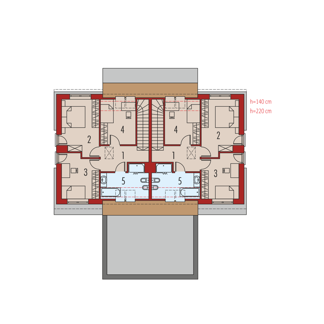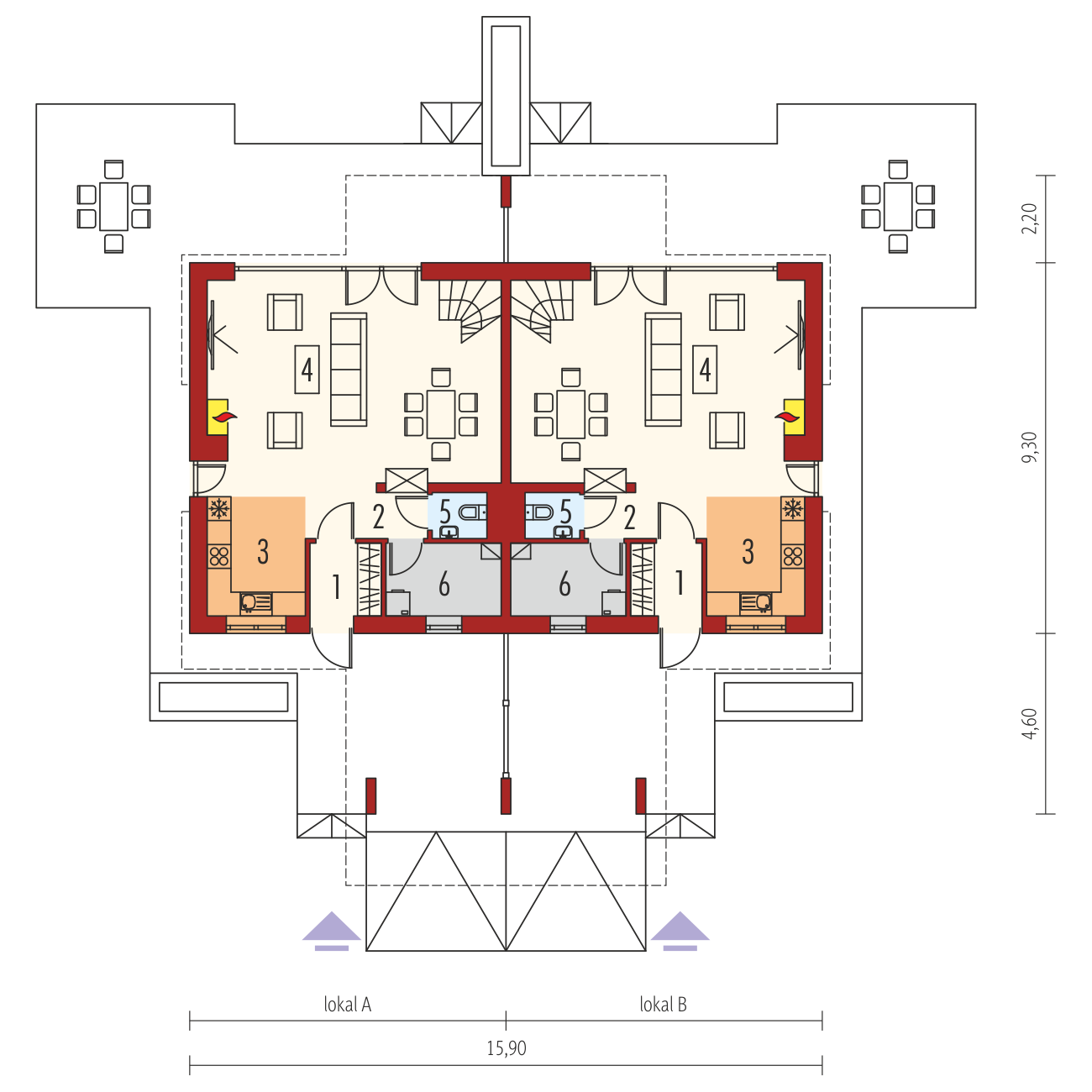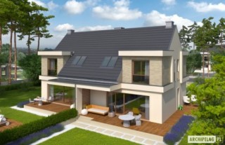 Dane powierzchniowe dotyczą całości budynku (obydwu lokali).Powierzchnie poszczególnych pomieszczeń na rzutach podano dla pojedynczego lokalu.Powierzchnia użytkowa każdego lokalu: 110,05 m². Koszty budowy oraz cena dokumentacji dotyczą całości budynku (obydwu lokali).Charakterystyka: dom jednorodzinny dwulokalowy, parterowy z poddaszem użytkowym, niepodpiwniczony, z wiatą garażowąPrzeznaczenie: dwa jednakowe lokale, każdy dla 3-4-osobowej rodziny Technologia i konstrukcja:Fundamenty: ławy, bloczki betonowe 24 cm, ocieplenie styropian 15 cmŚciany zewnętrzne: murowane, dwuwarstwowe, pustaki ceramiczne 24 cm, ocieplenie 20 cmŚciany wewnętrzne: murowane, pustaki ceramiczne 24 cm i 11,5 cmStrop: międzypiętrowy gęstożebrowy TerivaDach: konstrukcja drewniana, ocieplenie wełna mineralna 30 cm, dachówka ceramiczna płaska Bergamo firmy Röben w kolorze antracytowymInne: schody wewnętrzne drewniane Rozwiązania instalacyjne:Ogrzewanie: kocioł gazowy kondensacyjny, rozprowadzenie ciepła: grzejnikiWentylacja: grawitacyjna Wykończenie:Elewacje: tynk cienkowarstwowy mineralny w kolorze TO-PA001 z palety firmy Termo Organika, okładzina klinkierowa typu Jukon firmy RöbenStolarka: drewniana, PVC lub aluminiowa, drzwi wejściowe firmy Hörmann, rolety zewnętrzne w systemie CleverBox firmy BeCleverOkna połaciowe: rozwiązania technologiczne firmy FAKRO Otoczenie: system tarasowy ProDeck - deska kompozytowa Terra w kolorze złoty dąb i kasztanDostępne wersje:- Odbicie lustrzane Istnieje możliwość:- podpiwniczenia budynku- wykonania zabudowy bliźniaczej- wykonania budynku w technologii szkieletowej Atuty projektu okiem architekta:- Funkcjonalne i ergonomiczne wnętrze z podziałem na strefę dzienną na parterze i nocną na poddaszu- Duże przeszklenia w salonie- Wysoka ścianka kolankowa wpływająca na wygodę użytkowania pomieszczeń zlokalizowanych na poddaszu- Atrakcyjny, częściowo zadaszony taras od strony ogrodu- Wygodne zadaszenie nad wejściem do budynku jako osłona przed wiatrem i śniegiem- Praktyczna wiata samochodowa z dwoma miejscami postojowymi