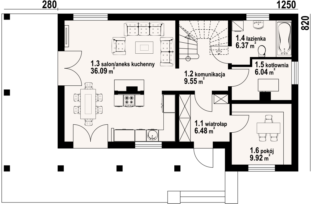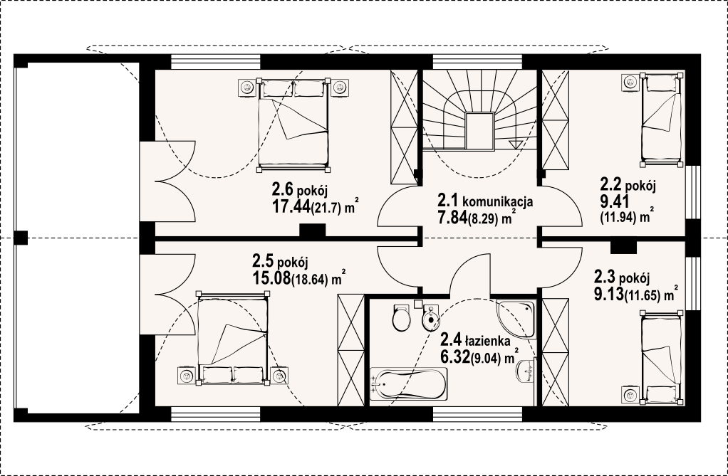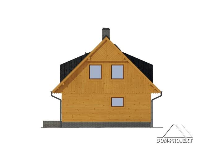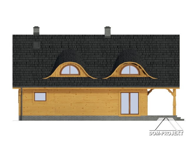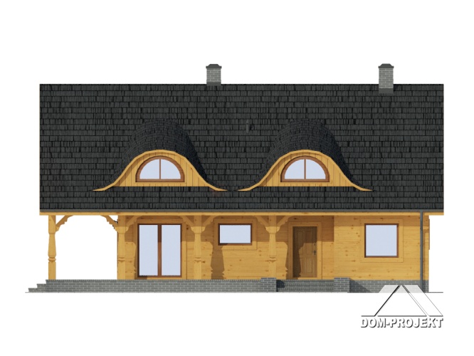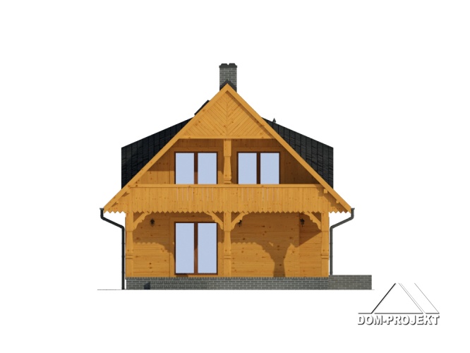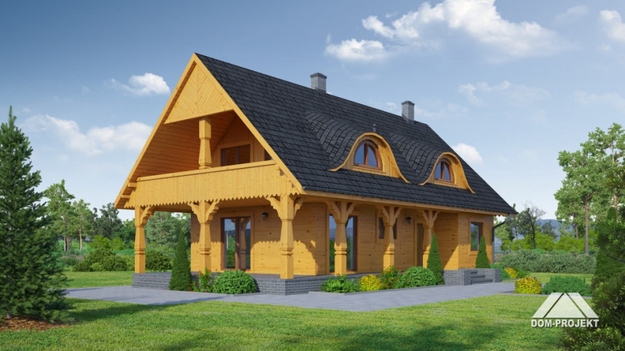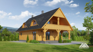 Dom z bali drewnianych. Duży salon z aneksem kuchennym, kominkiem i wyjściami na zadaszony taras. Pokój, łazienka, komunikacja, wiatrołap i kotłownia. Na poddaszu cztery pokoje, łazienka, komunikacja i duży balkon. Zwarta bryła budynku i dwuspadowy dach sprzyjają szybkiej i taniej budowie i niskim kosztom eksploatacji.