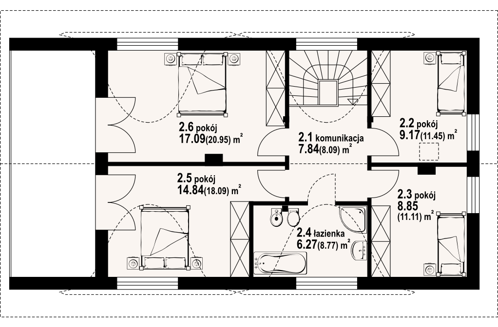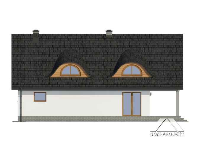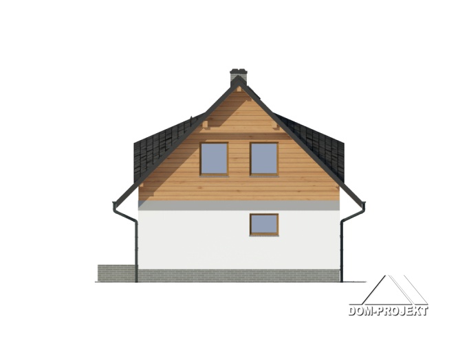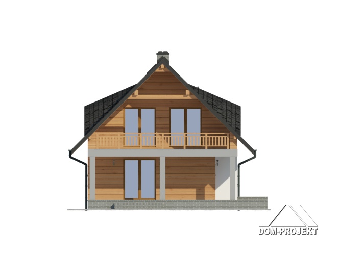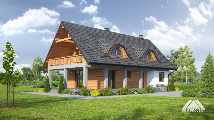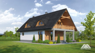 Wygodny dom z dużym zadaszonym tarasem. Duży salon z aneksem kuchennym, kominkiem i wyjściami na zadaszony taras. Pokój, łazienka, komunikacja, wiatrołap i kotłownia. Na poddaszu cztery pokoje, łazienka, komunikacja i duży balkon. Zwarta bryła budynku i dwuspadowy dach sprzyjają szybkiej i taniej budowie i niskim kosztom eksploatacji.