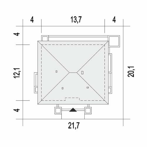 Wejście do budynku poprzez wiatrołap. Z wiatrołapu po kilku stopniach wyjście do holu. Z holu dostępny pokój dzienny, kuchnia z aneksem jadalnym, pokój gościnny, łazienka i spiżarnia. Na poddaszu znajdują się 3 pokoje sypialne, łazienka i garderoba. Budynek jest częściowo podpiwniczony. Piwnice mieszczą garaż, kotłownię oraz pralnię. Dodatkowo pod tarasem znajduje się pomieszczenie gospodarcze dostępne z zewnątrz. Zwarta bryła budynku wzbogacona została balkonami, tarasem wysuniętym aneksem jadalnym. Dodatkowym akcentem są lukarny (klatki schodowej i balkonowa).