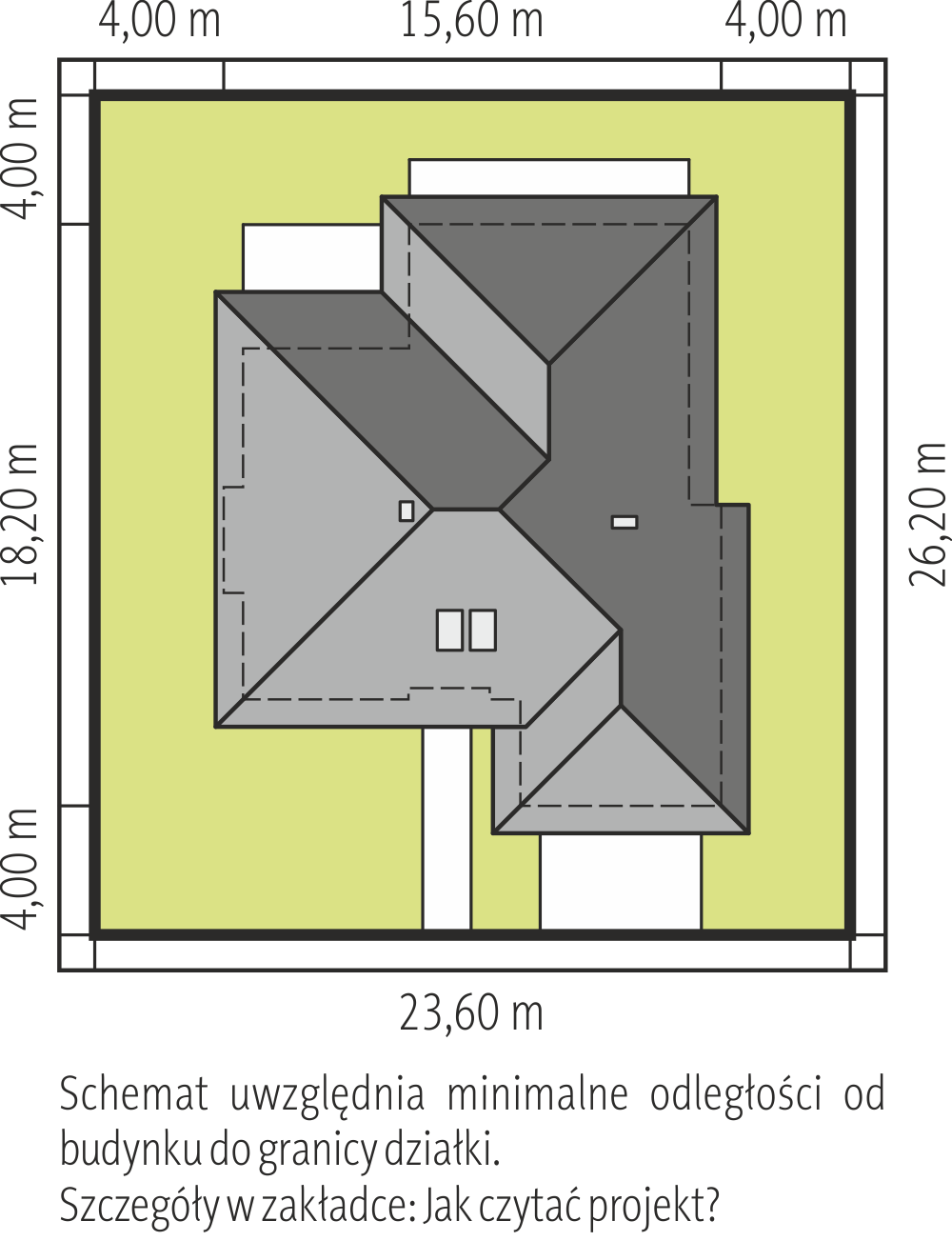 Wejście przez sień do holu. Z holu: na prawo - kuchnia i jadalnia, na lewo - pokój gościnny, w.c., spiżarnia i pralnia z kotłownią, na wprost pokój dzienny. Na poddaszu zlokalizowano 4 pokoje sypialne, łazienkę, w.c. z prysznicem i przedpokój. Mocno rozrzeźbiona bryła budynku na urozmaiconym rzucie, nakryta wielospadowymi dachami o kącie nachylenia połaci 35°. Malownicze podcienie - wejściowy i ogrodowy oraz charaktyrystyczna wieża podkreślone są dodatkowo oblicówką kamienną. Orginalny budynek dla poszukujących czegoś nietuzinkowego.