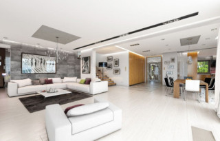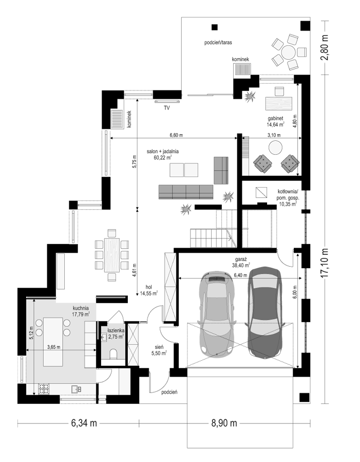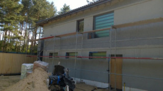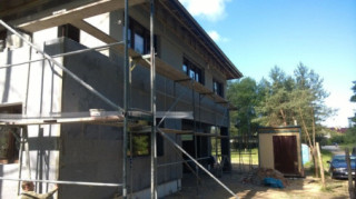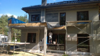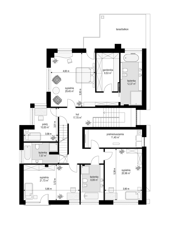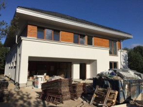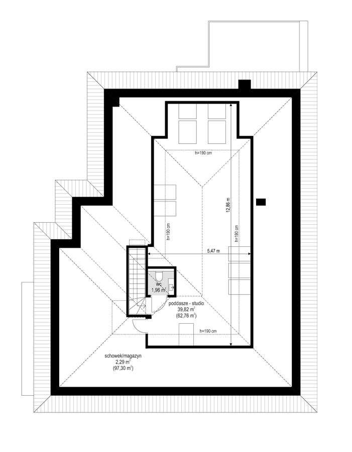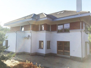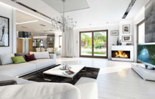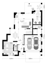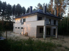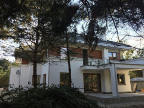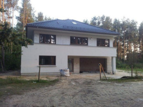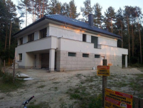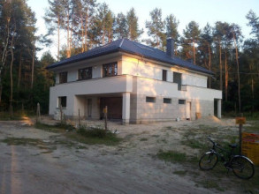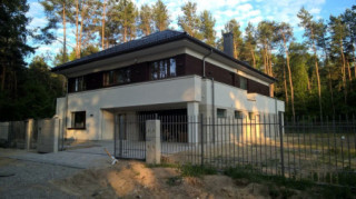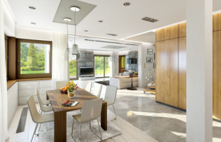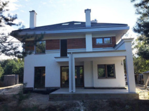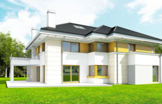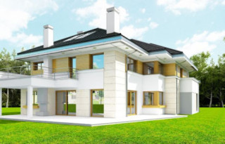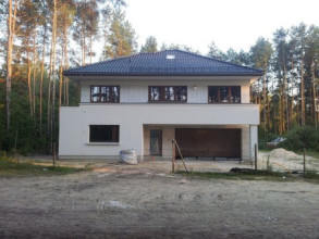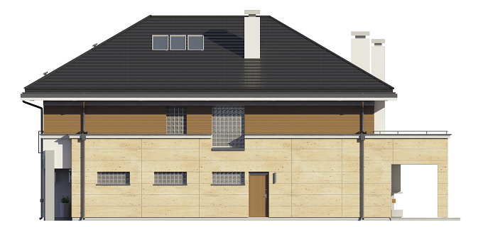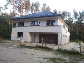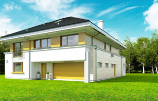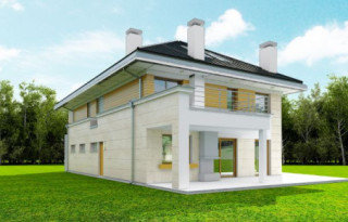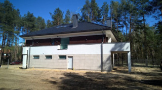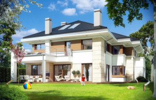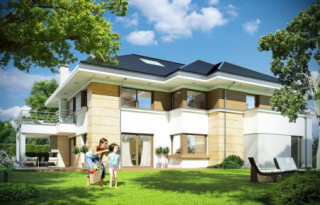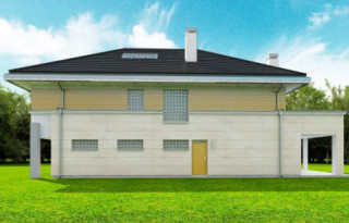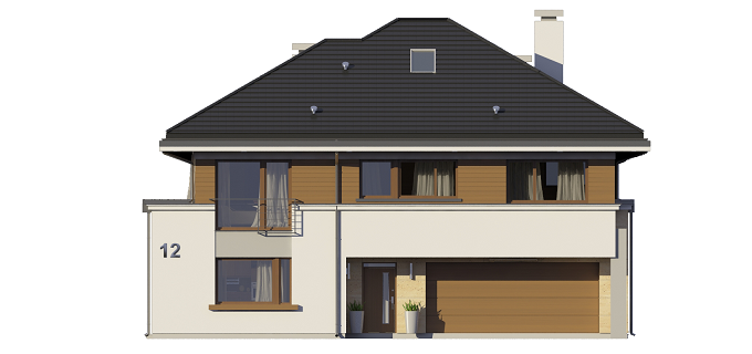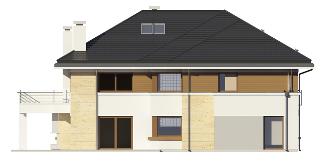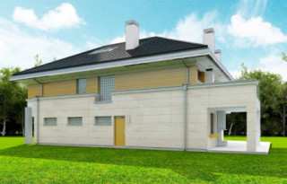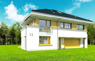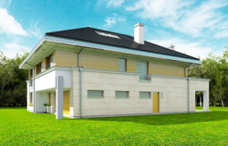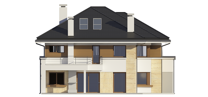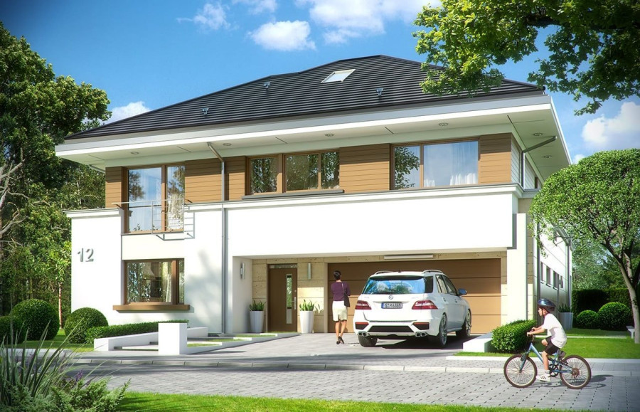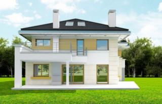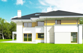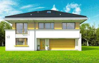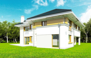 Prezentujemy Państwu projekt domu jednorodzinnego Rezydencja leśna. Jest to piętrowy, duży, komfortowy dom, przeznaczony dla rodziny 4- 6-osobowej. Projekt domu Rezydencja Leśna jest nowoczesny, ma zwartą bryłę, oraz funkcjonalne wnętrze. Został zaprojektowany w stylu piętrowej miejskiej willi. Główna bryła przekryta jest czterospadowymi dachami - elewacja frontowa jest szersza i zwęża się w kierunku ogrodu, dzięki czemu dom ma dwa oblicza: masywny reprezentacyjny przód i bardziej rozczłonkowany tył z załamaniami i dobudówkami, utrzymujący ludzką skalę. Elewacje zostały podzielone na poziome pasy - uzyskano w ten sposób lżejszą i ciekawszą sylwetkę budynku. Duże przeszklenia, narożne okna, wcięcia i wystające wykusze ozdabiają dom i nadają mu nowoczesny dynamiczny charakter. Wnętrze domu jest bardzo komfortowe i zawiera wszystko czego właściciele mogliby sobie zamarzyć. Na parterze szerokim przeszklonym wejściem z przedsionka wchodzimy do jednoprzestrzennego salonu połączonego z jadalnią i holem. Pokój dzienny łączy się pięknymi przeszkleniami z tarasem i ogrodem. Częściowo otwarta na jadalnię kuchnia z wyspą i spiżarnią usytuowana jest od frontu - z dużym oknem na wejście do domu. Na parterze znajdują się też: dwustanowiskowy garaż, kotłownia, oraz gabinet. Taras od strony ogrodu przykryty jest częściowo zadaszeniem. Piętro zawiera cztery duże sypialnie, w tym wygodny apartament rodziców, z własną łazienką, garderobą i tarasem ogrodowym. Dodatkowo są tutaj dwie łazienki i pomieszczenie pralni. Na samej górze domu zlokalizowany jest strych, który można wykorzystać na poddasze użytkowe i zrobić tam np. pomieszczenie rekreacyjne. Projekt domu Rezydencja Leśna zaprojektowano z wykorzystaniem energooszczędnym materiałów i technologii, dzięki czemu, mimo niemałej powierzchni, jego koszty utrzymania nie będą duże.